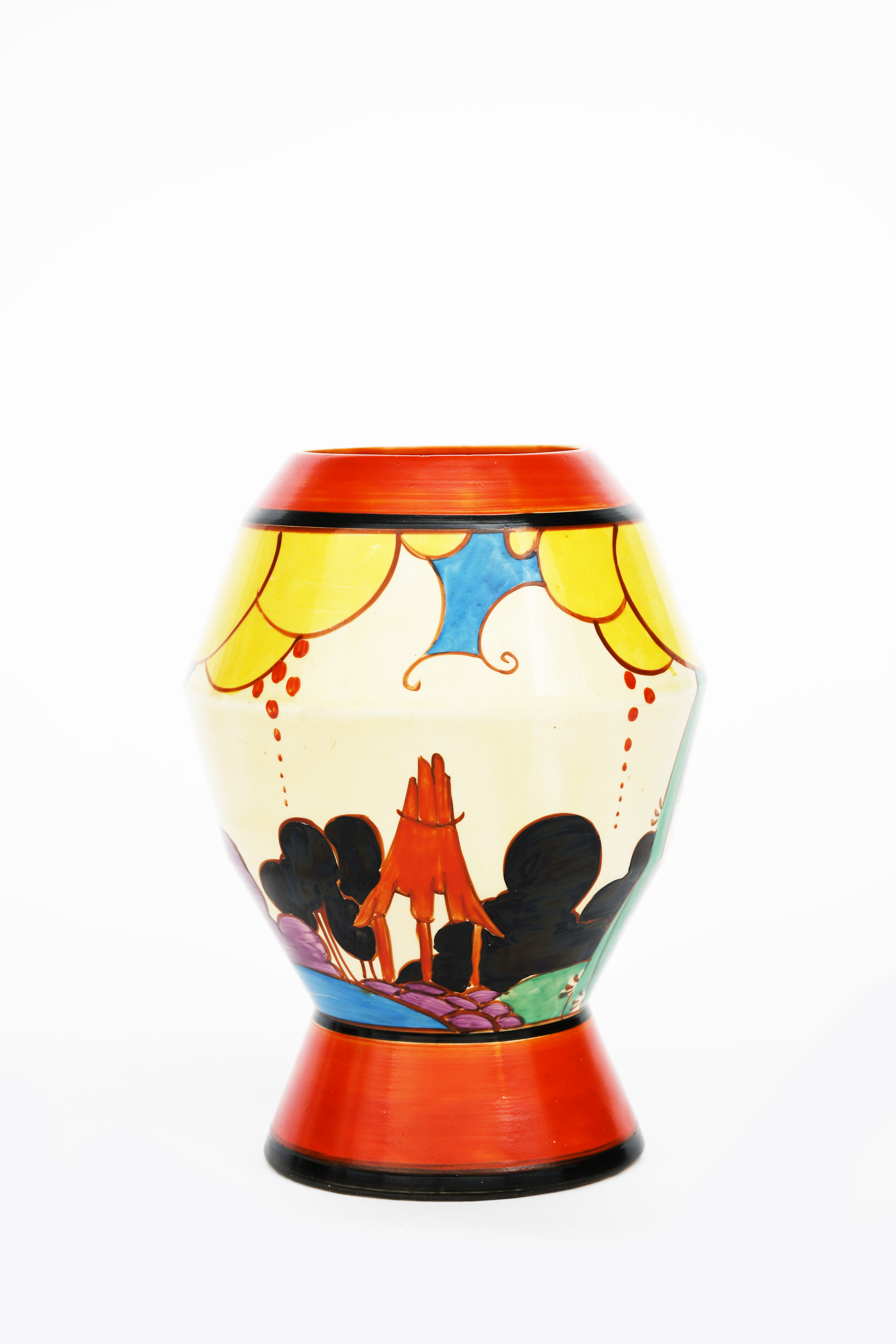 'Summerhouse' a Clarice Cliff Fantasque Bizarre vase, shape no. 365, painted in colours inside black