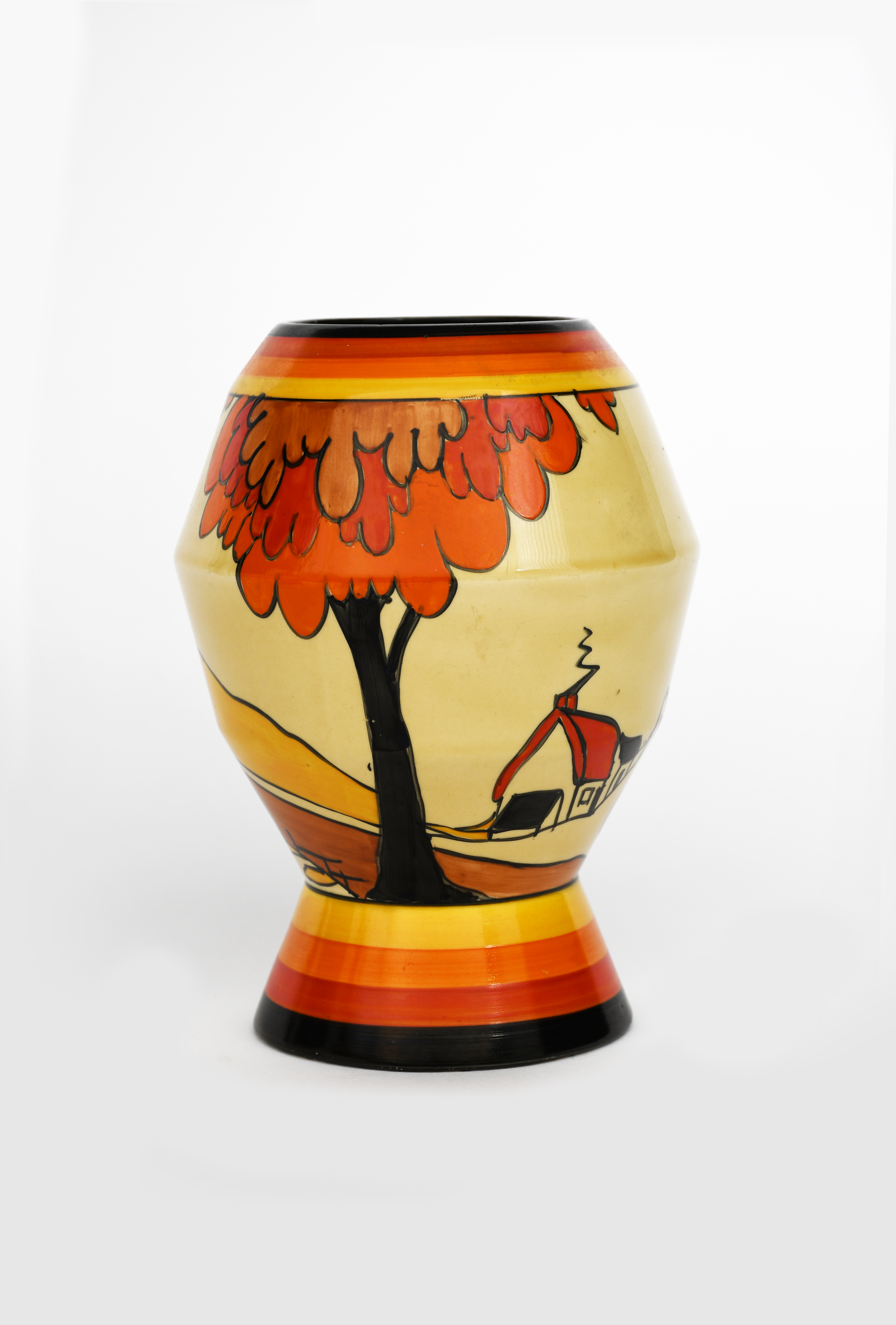 'House and Bridge' a Clarice Cliff Fantasque Bizarre vase, shape no.365, painted in colours between yellow, orange and black bands, printed factory marks, 20.5cm. high