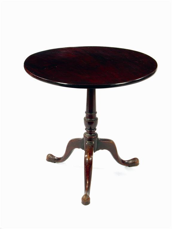 A late George III mahogany tripod table, the circular tilt top missing the clasp, on a brass turned stem to faceted scroll legs, 28.75in (73cm) h, 29.75in (75.5cm) dia.
