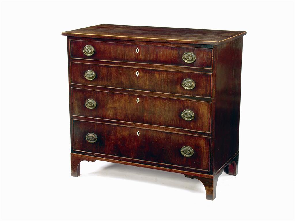 A small mahogany chest, with four long graduated drawers, fitted oval embossed lion plates handles, 19th century and later, 34.5in (87.5cm) h, 37.25in (94.5cm) w, 19in (48cm) d.