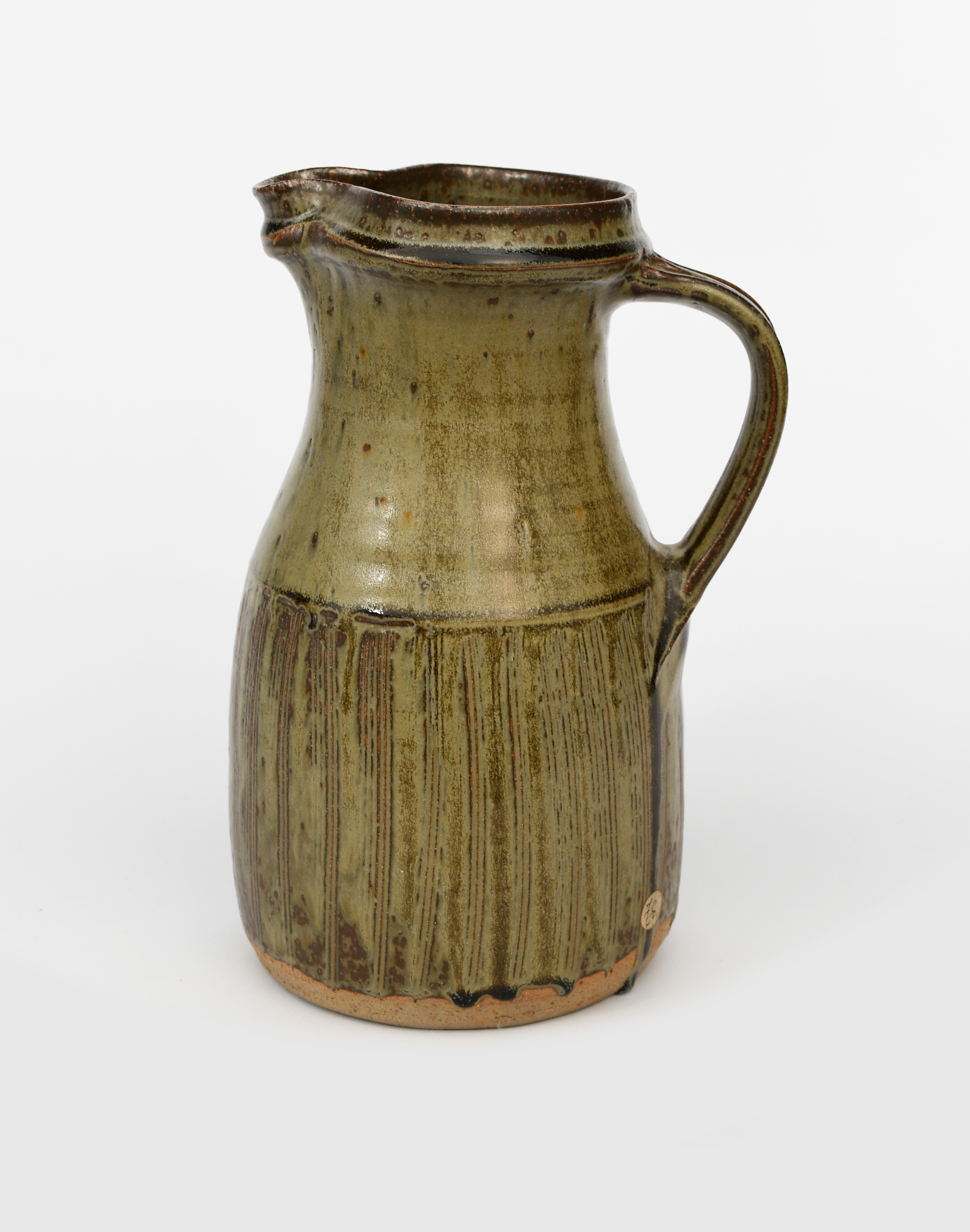 a tall stoneware jug, with combed vertical decoration, glazed ash to the foot,