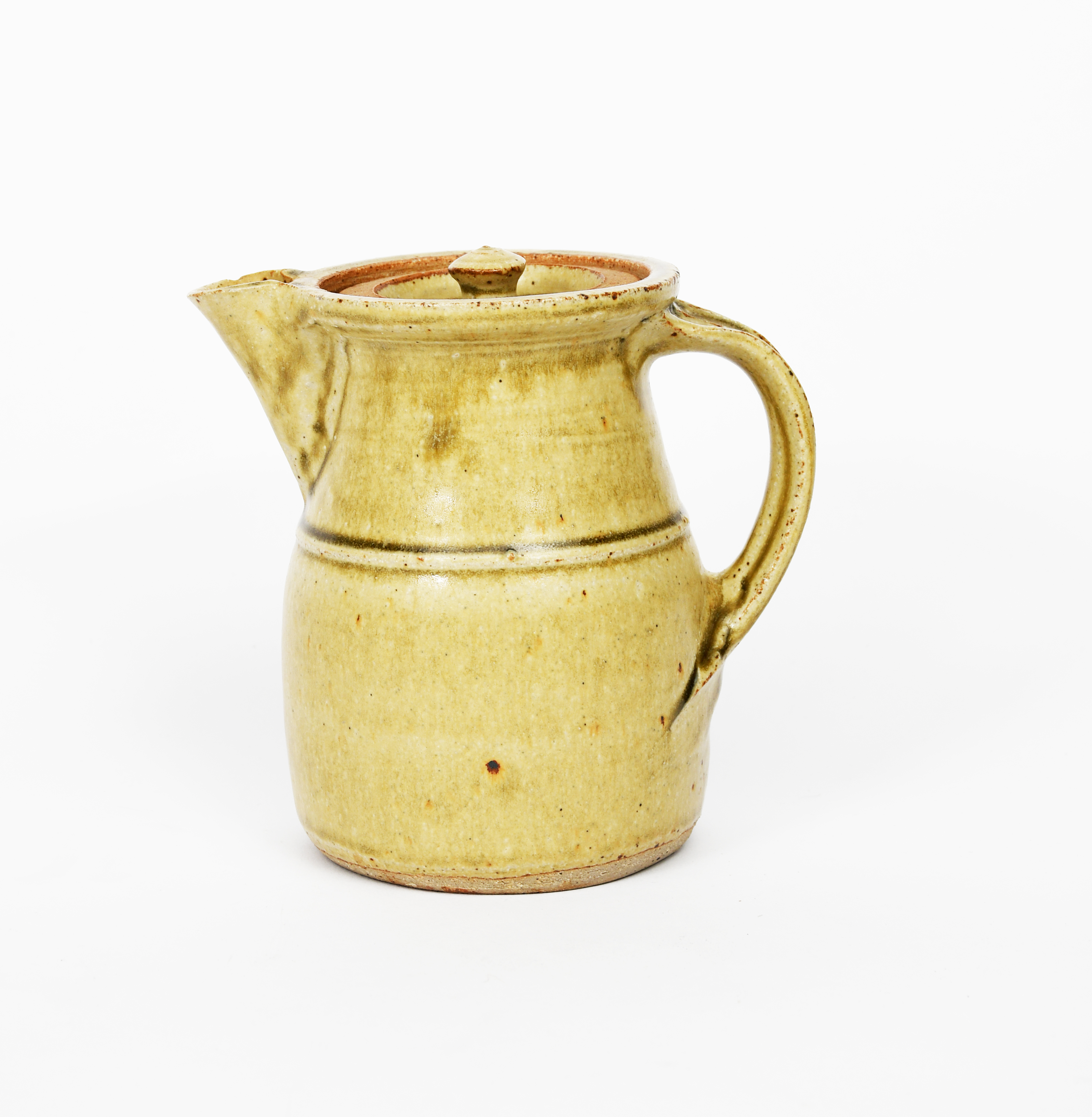 a stoneware coffee pot and cover, covered to the foot with an ash glaze,