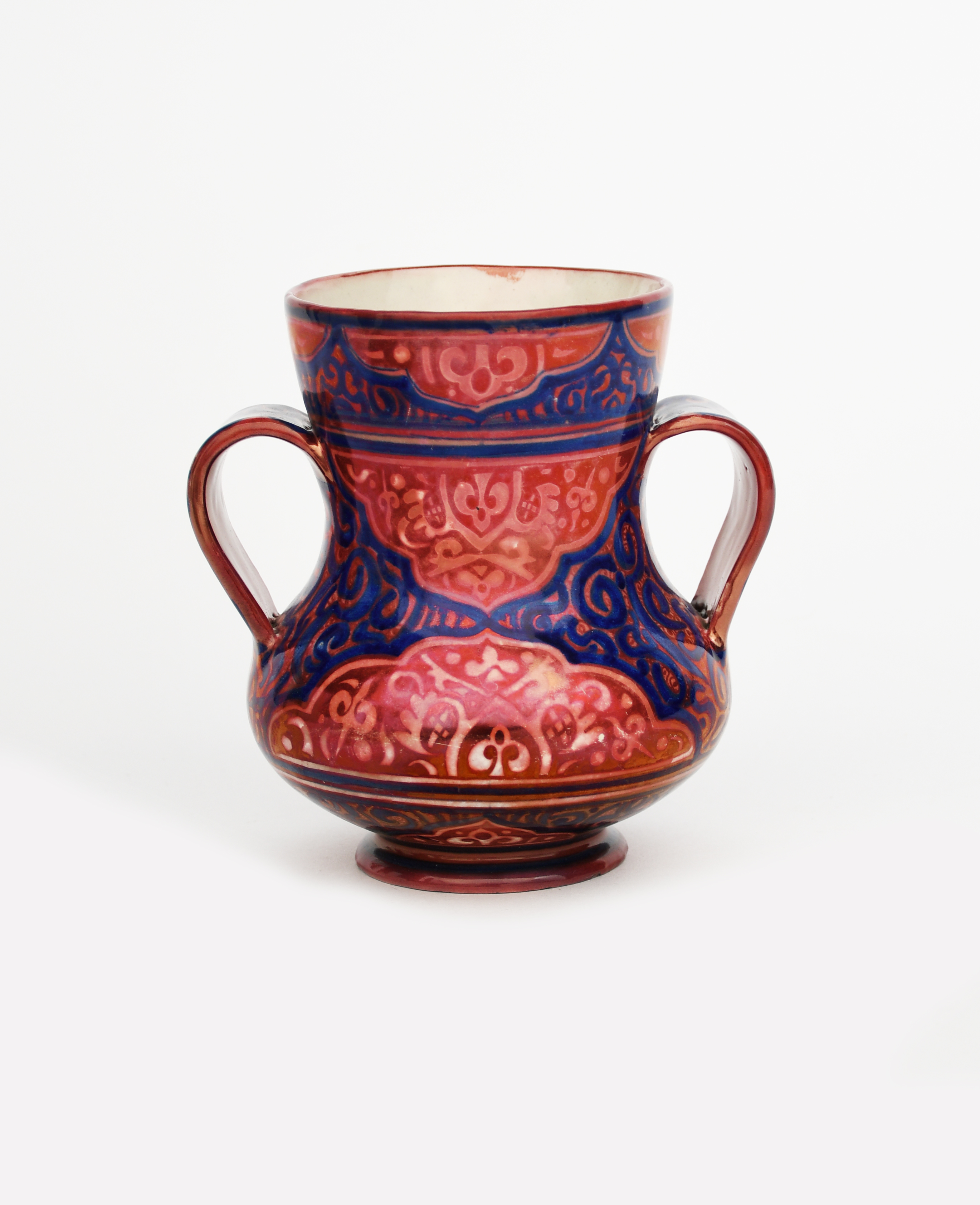 A Cantagalli Pottery Hispano-Moresque twin-handled vase, painted with panels in ruby and blue