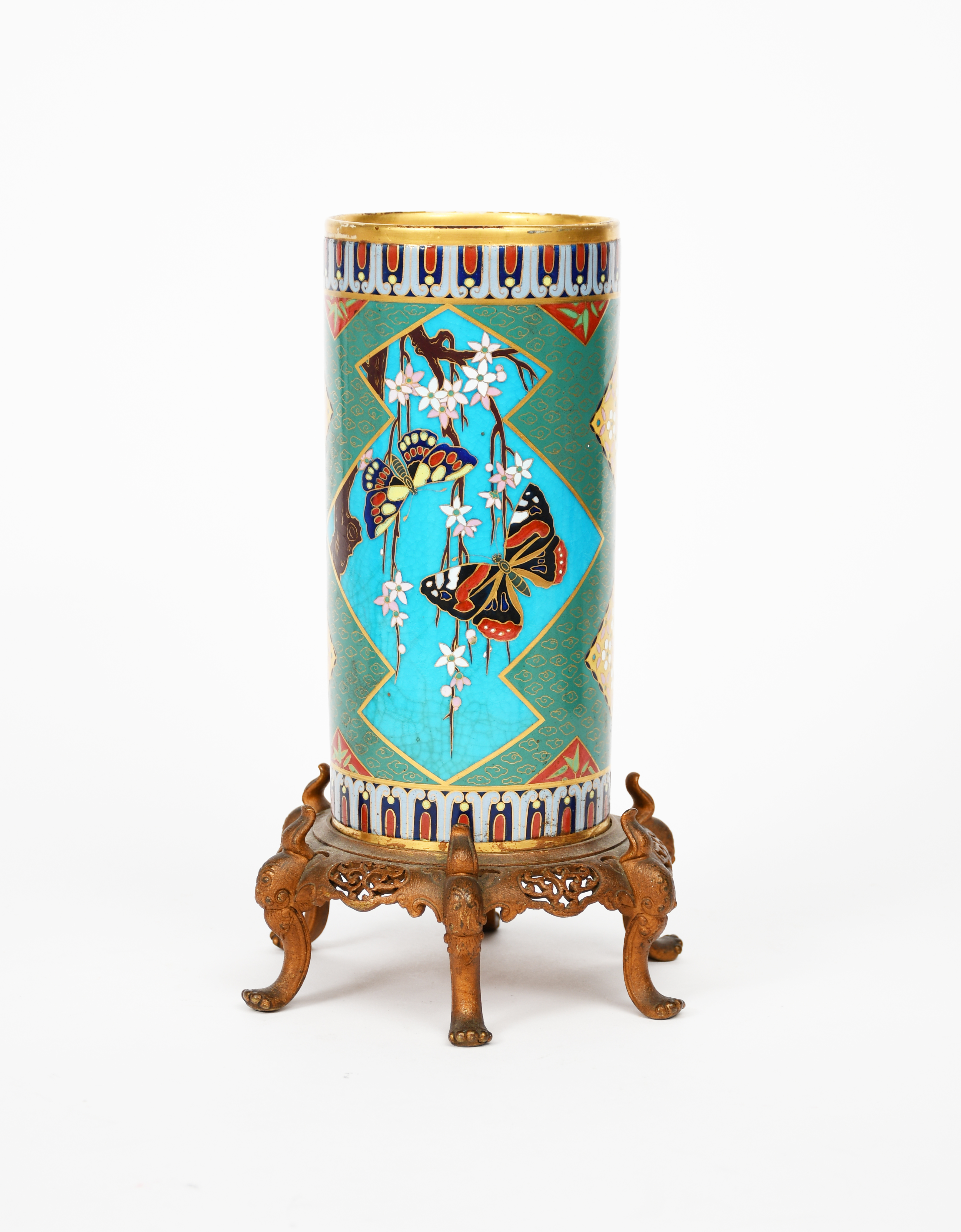 An Aesthetic Movement Cloisonne vase probably French, in the manner of Dr Christopher Dresser for Mintons, on gilt metal mount, the cylindrical vase printed and painted with panels of butterflies in colours and gilt on a turquoise ground, indistinct makers plaque to the interior, crazed 28.5cm. high