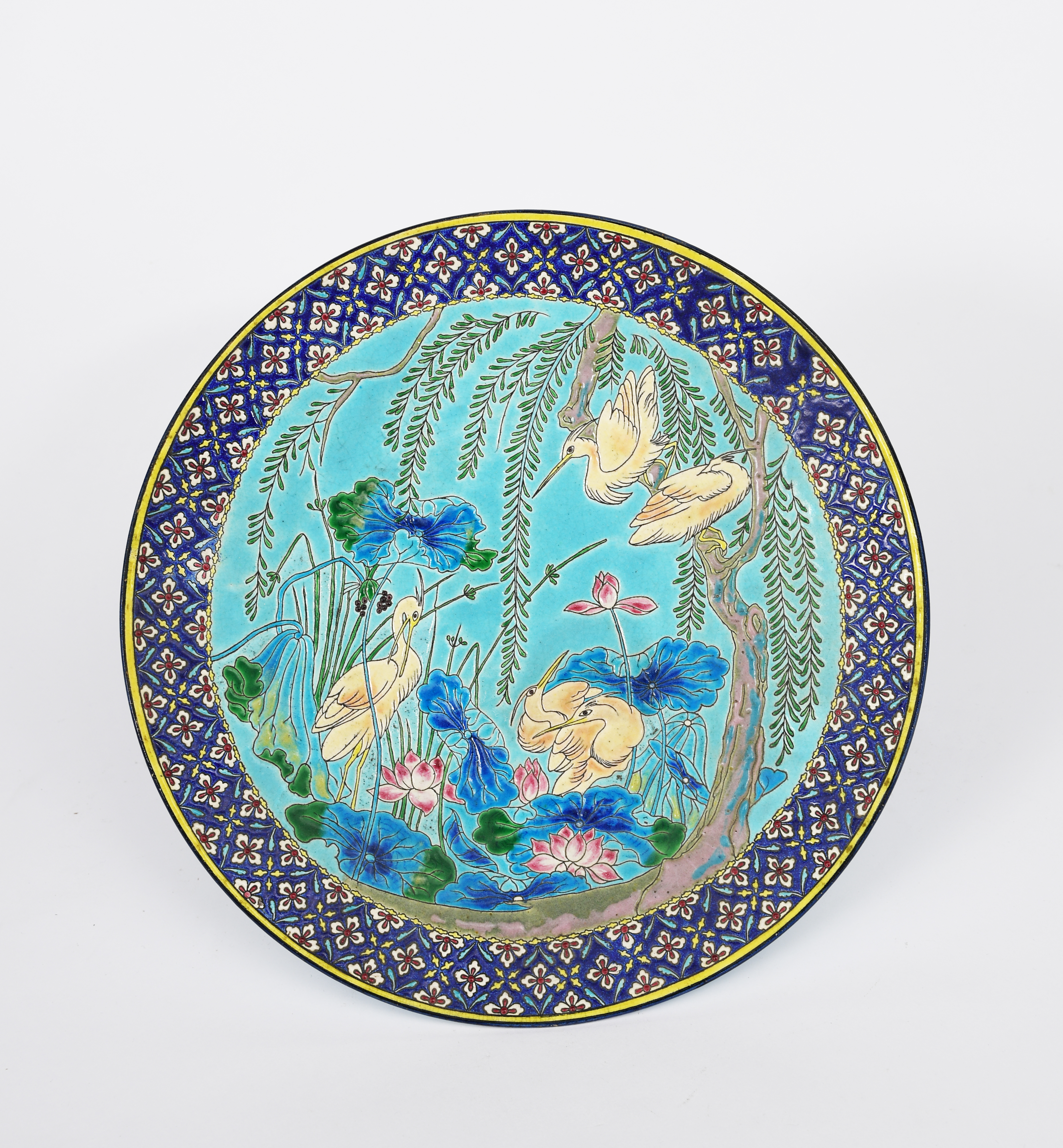 A Longwy Pottery plate, shape no.1283, decorated with cranes amidst water-lily flowers, in colours impressed marks, 31cm.diam.