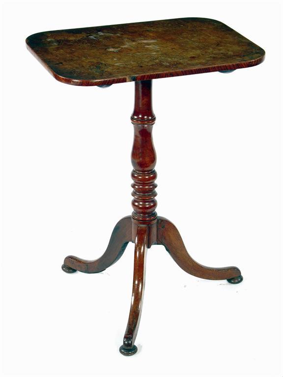 A George IV oak tripod table, the rectangular pollarded tilt top on a ring turned vase stem to three scroll legs, 29in (73.5cm) h, 16 x 21.5in (40.5 x 54.5cm) the top.