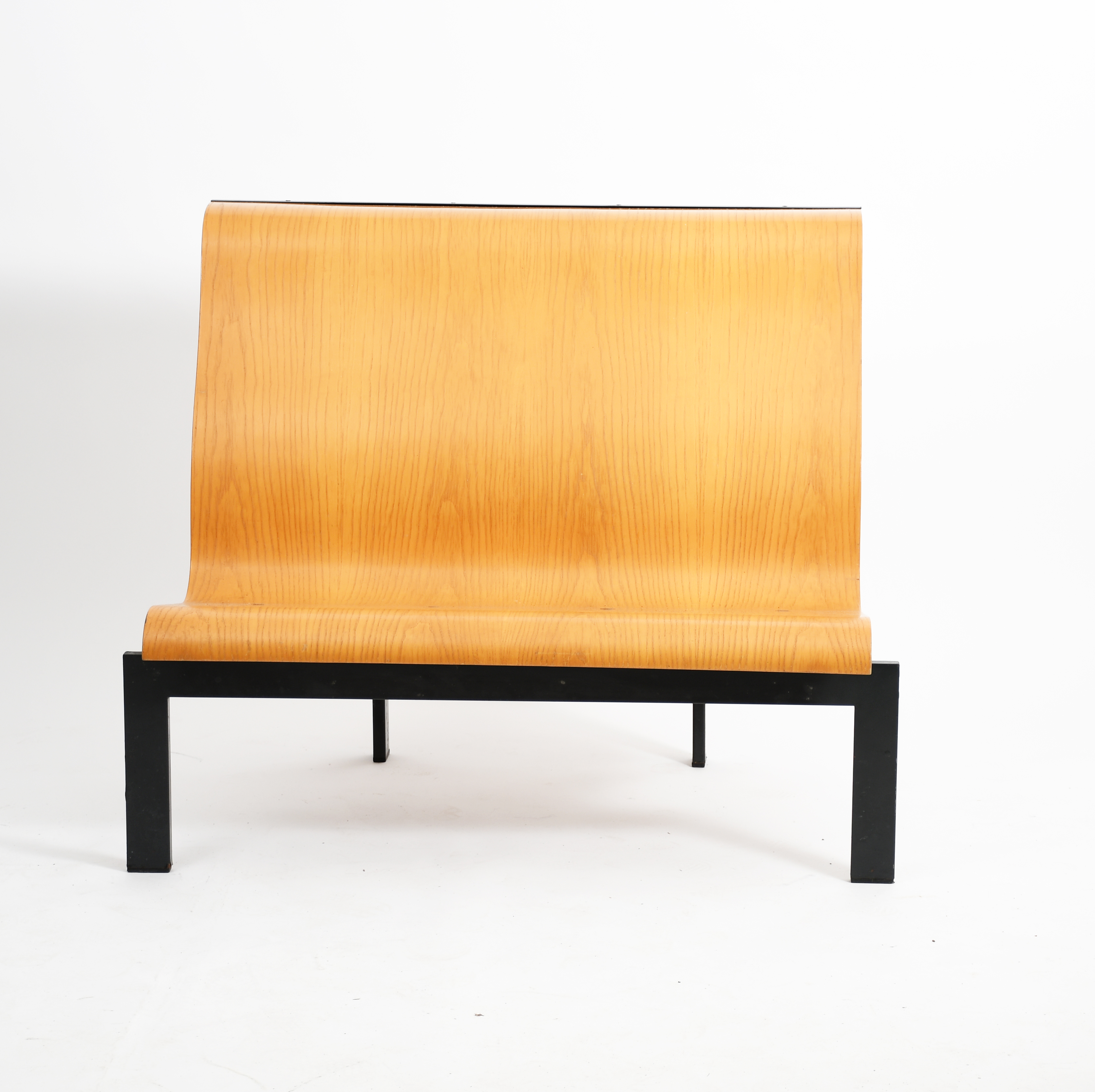 A Havana Bench designed by Joseph Massaca, curved plywood seat on painted metal frame