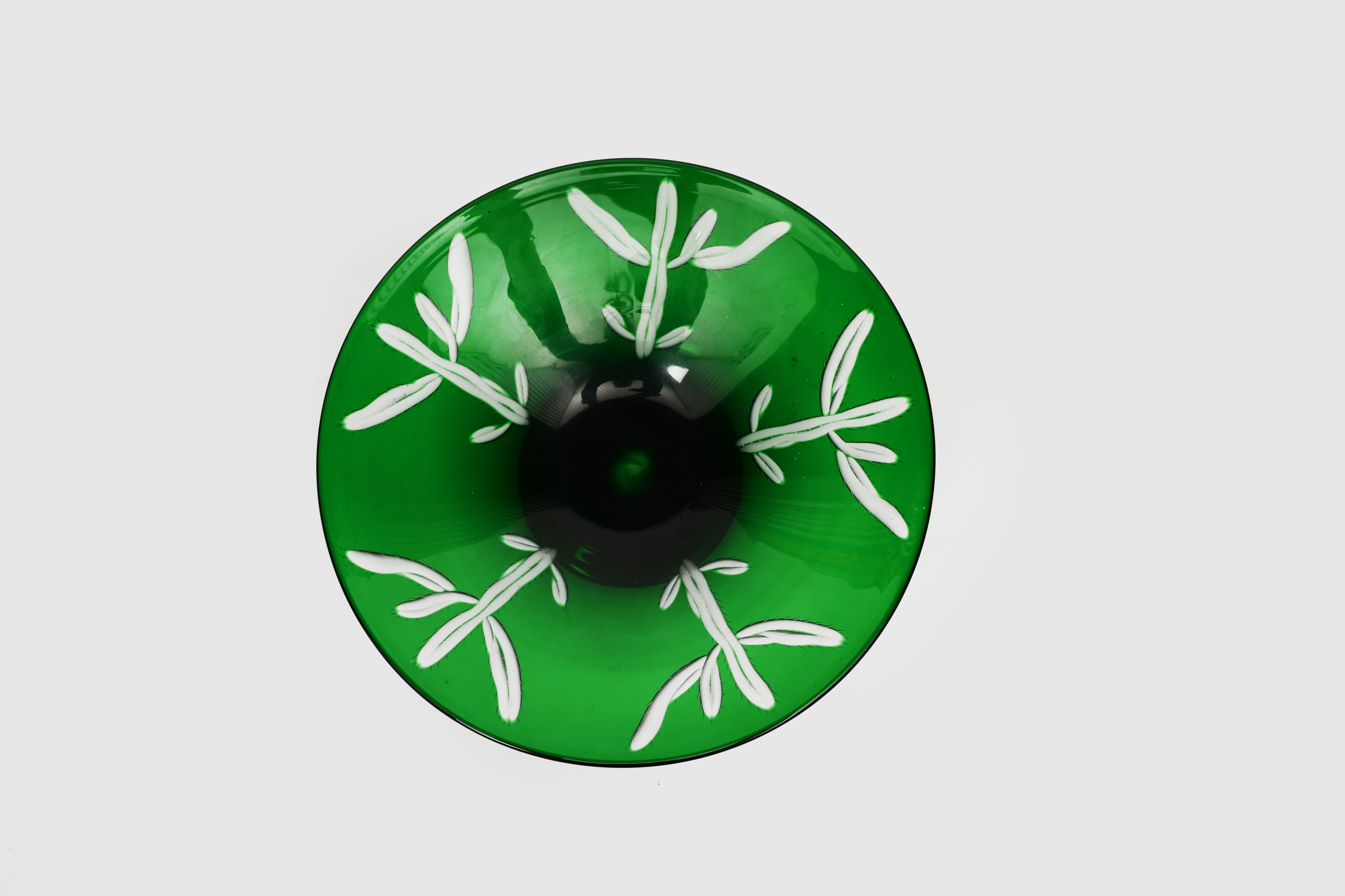 A glass cactus bowl the design attributed to Keith Murray, probably manufactured by Stevens & Williams, clear glass cased in green, cut with five radiating cactus plants, apparently unsigned, 29.5cm. diam.