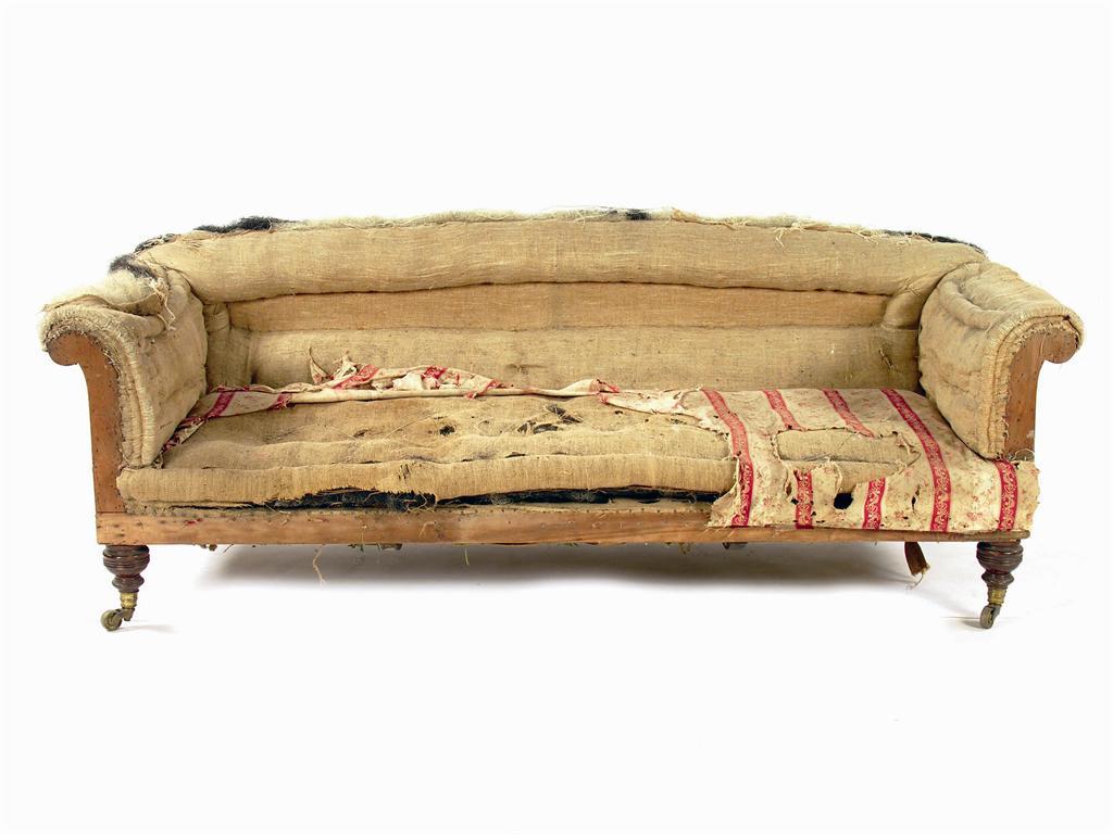Howard & Sons. A scroll end settee, un-upholstered, on turned oak legs, the back left stamped '1758, 1033,' the brass castors stamped 'Howard & Sons Ltd London,' 31in (78.5cm) h, 83in (211cm) w, 32.5in (82.5cm) d.
