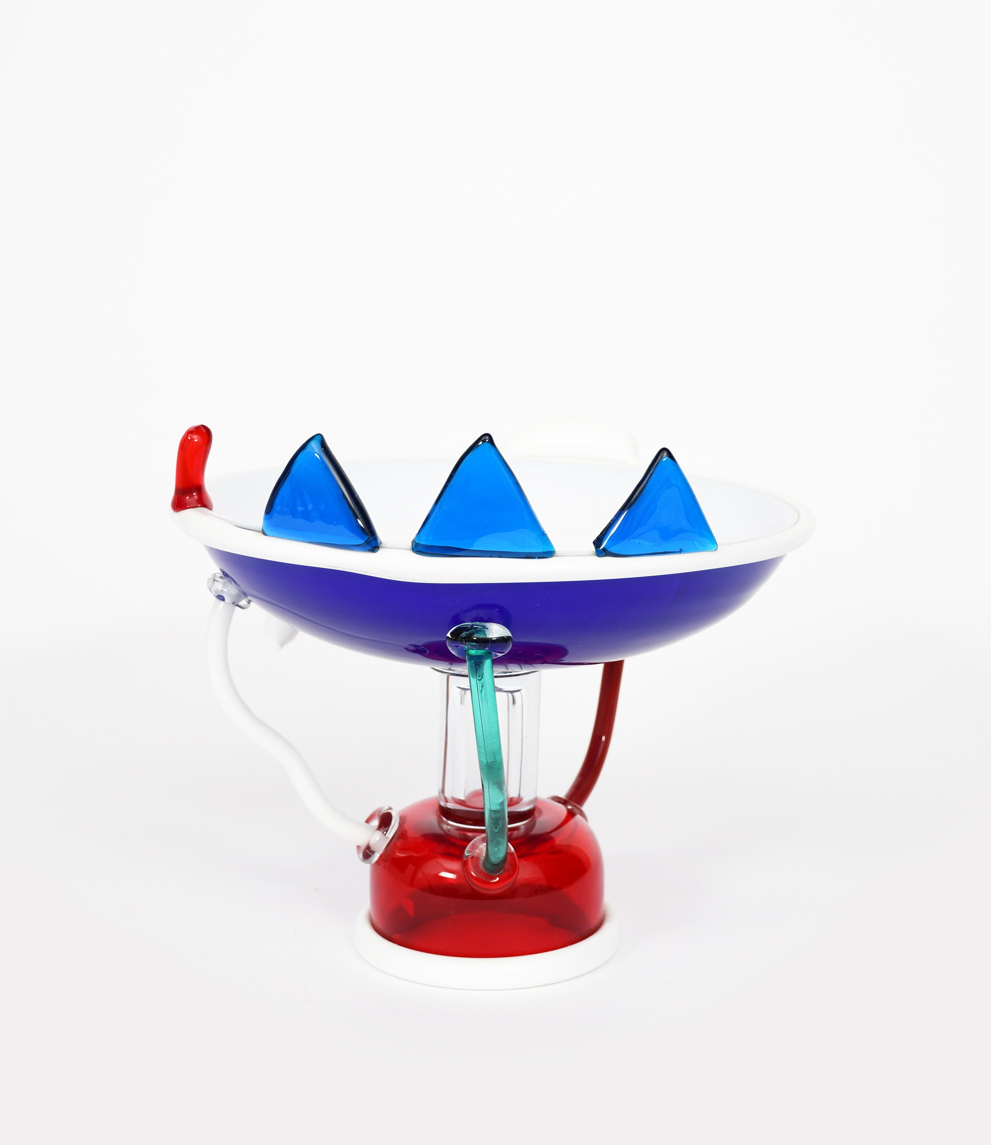 Φ A Memphis Milano Sol glass bowl designed by Ettore Sottsass, designed 1982, blue glass bowl on clear stem and red domed base, highlighted with white glass, applied red, green and white supports, the rim with blue glass triangles and red panel, etched E Sottsass Memphis to side, 26cm. high