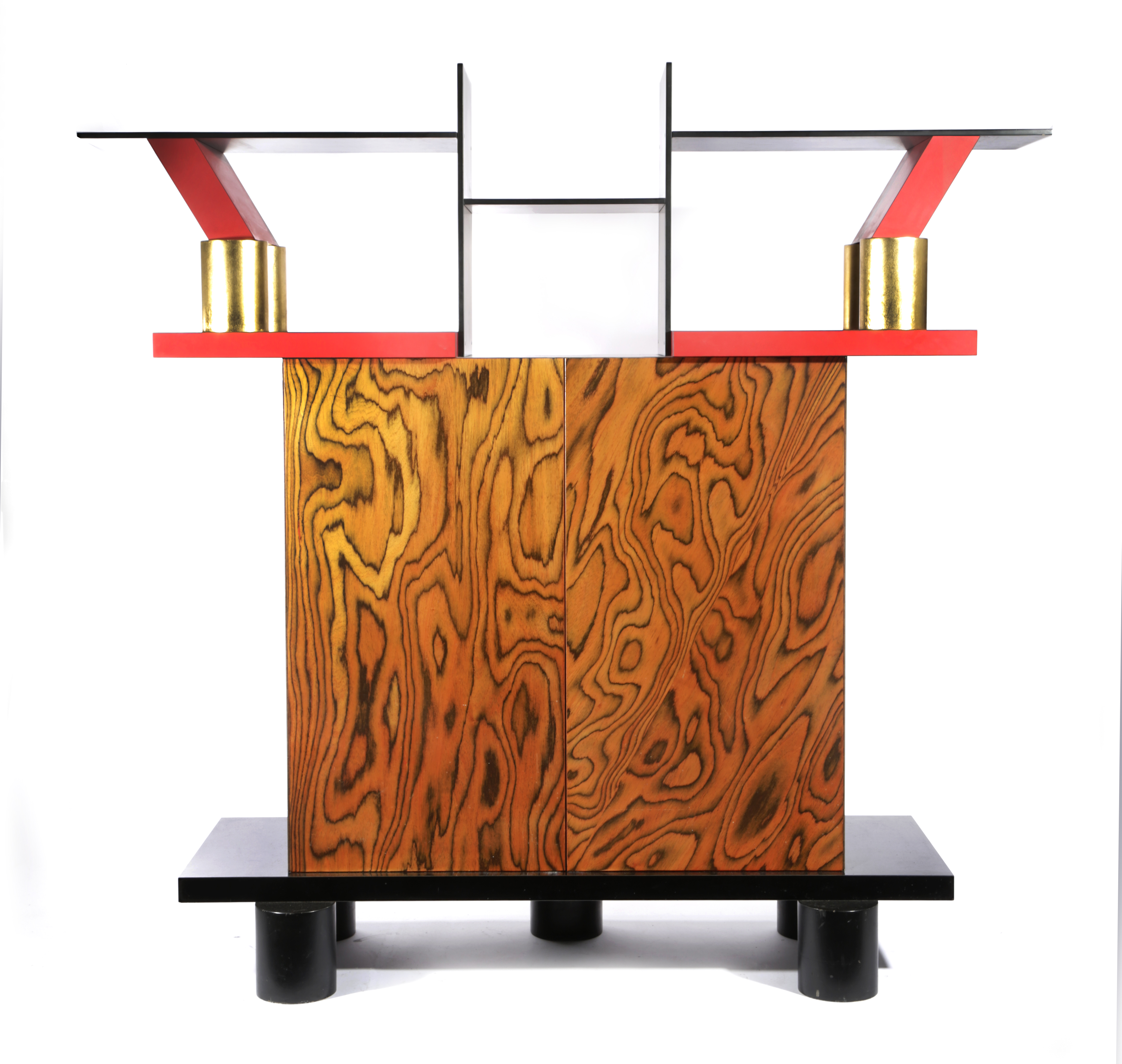 Φ A Memphis Milano Freemont cabinet designed by Ettore Sottsass, designed 1985,raised, shelved structure with coloured laminates and gilded columns above twin rectangular door compartment with painted wood finish, on ebonised base