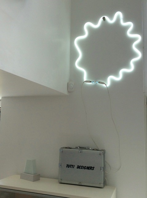 A Meta Memphis Tutti Designers neon lamp designed by Michelangelo Pistoletto, designed 1989, shaped neon tube light and aluminium suitcase screen printed factory marks,
