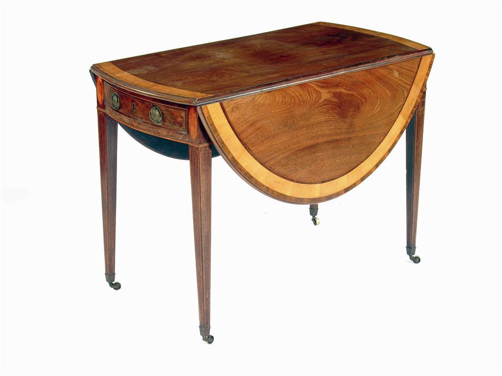 A 19th century mahogany Pembroke table, the oval top crossbanded in satinwood, rosewood and inlaid stringing to a moulded edge the frieze drawer and false reverse fitted later differing brass plate handles on satinwood panelled headed square tapering legs to brass castors, 28.5in (72.5cm) h, 48.5in (123cm) open, 40in (101.5cm) d.