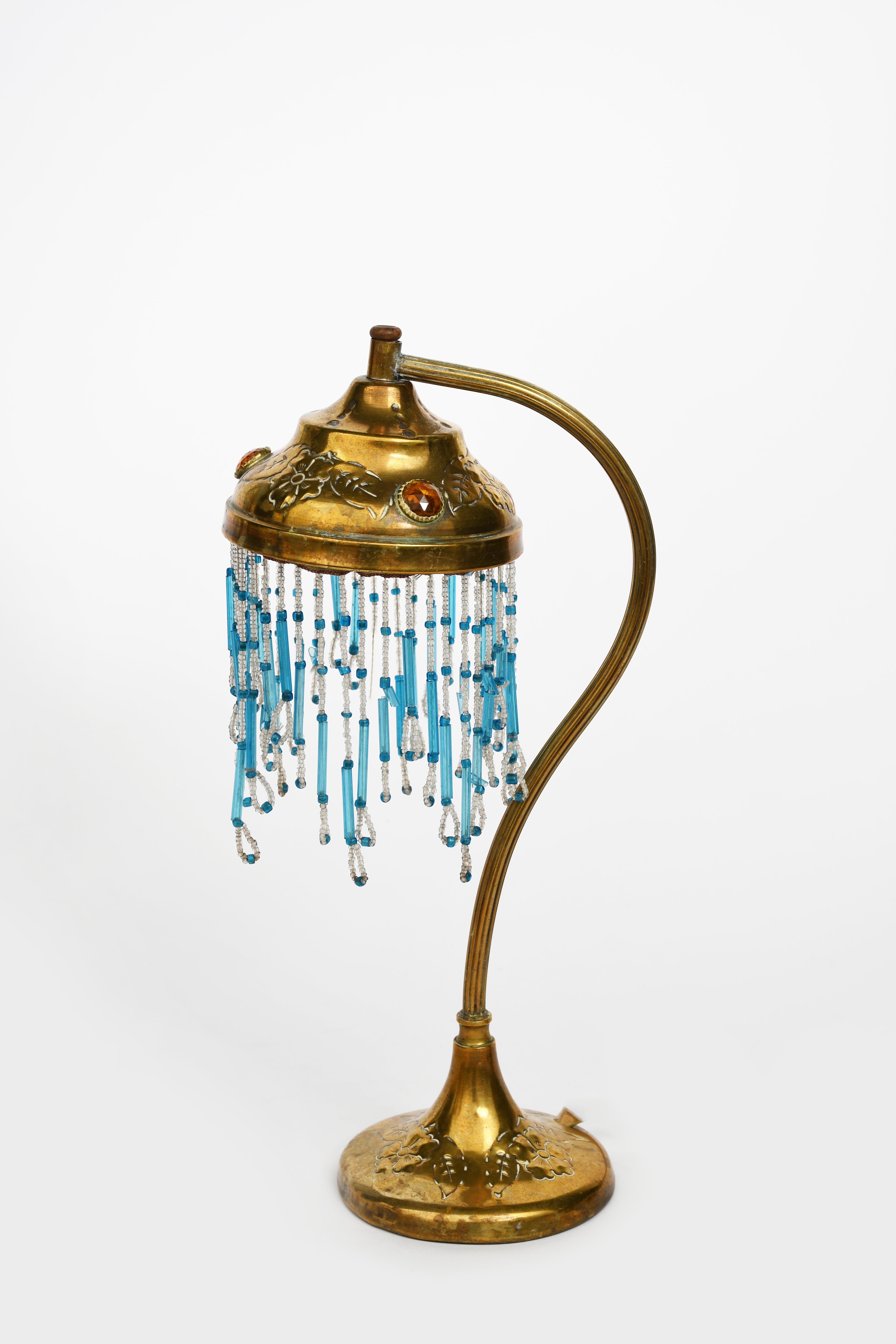 An Art Nouveau brass desk lamp, tapering, circular base with curved reed stem, the shade with amber glass jewels, stamped in low relief with flowers, unsigned, 38cm. high