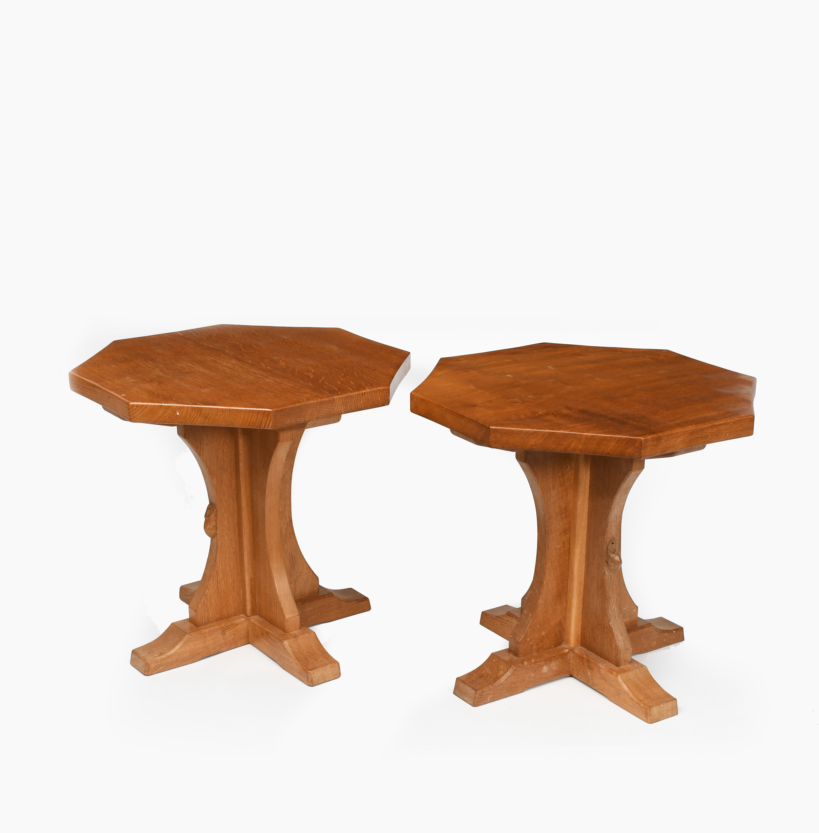 A pair of Robert Mouseman Thompson oak side tables, each with adzed octagonal top on curved cruciform pedestal, carved mouse signature to side 48cm. high, 49cm diameter top, (2)