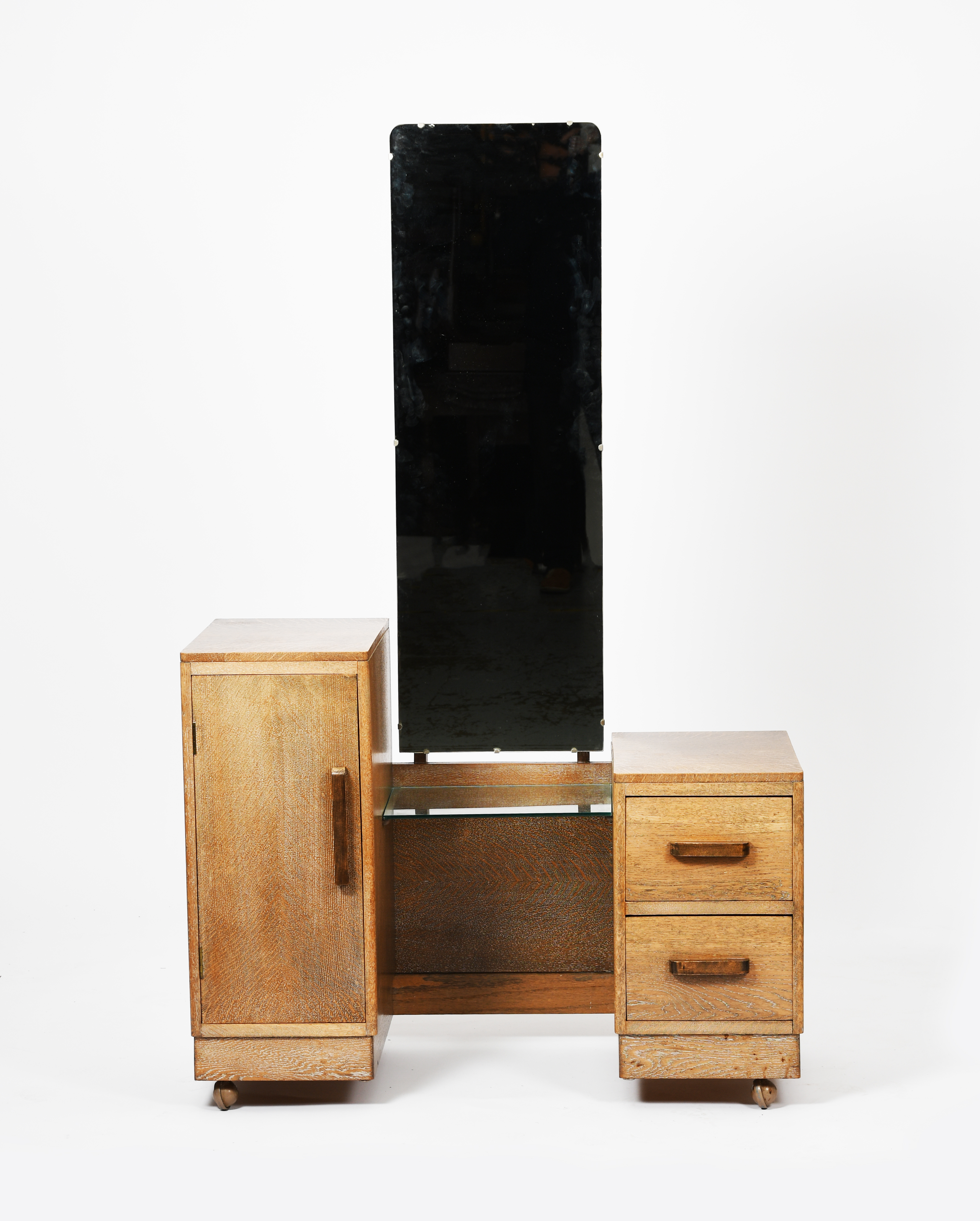 A limed oak dressing table in the manner of Heals, asymmetric form, tall single cupboard and shorter two drawer pedestal, flanking central glass shelf, below a central mirror, on later castors, unsigned,