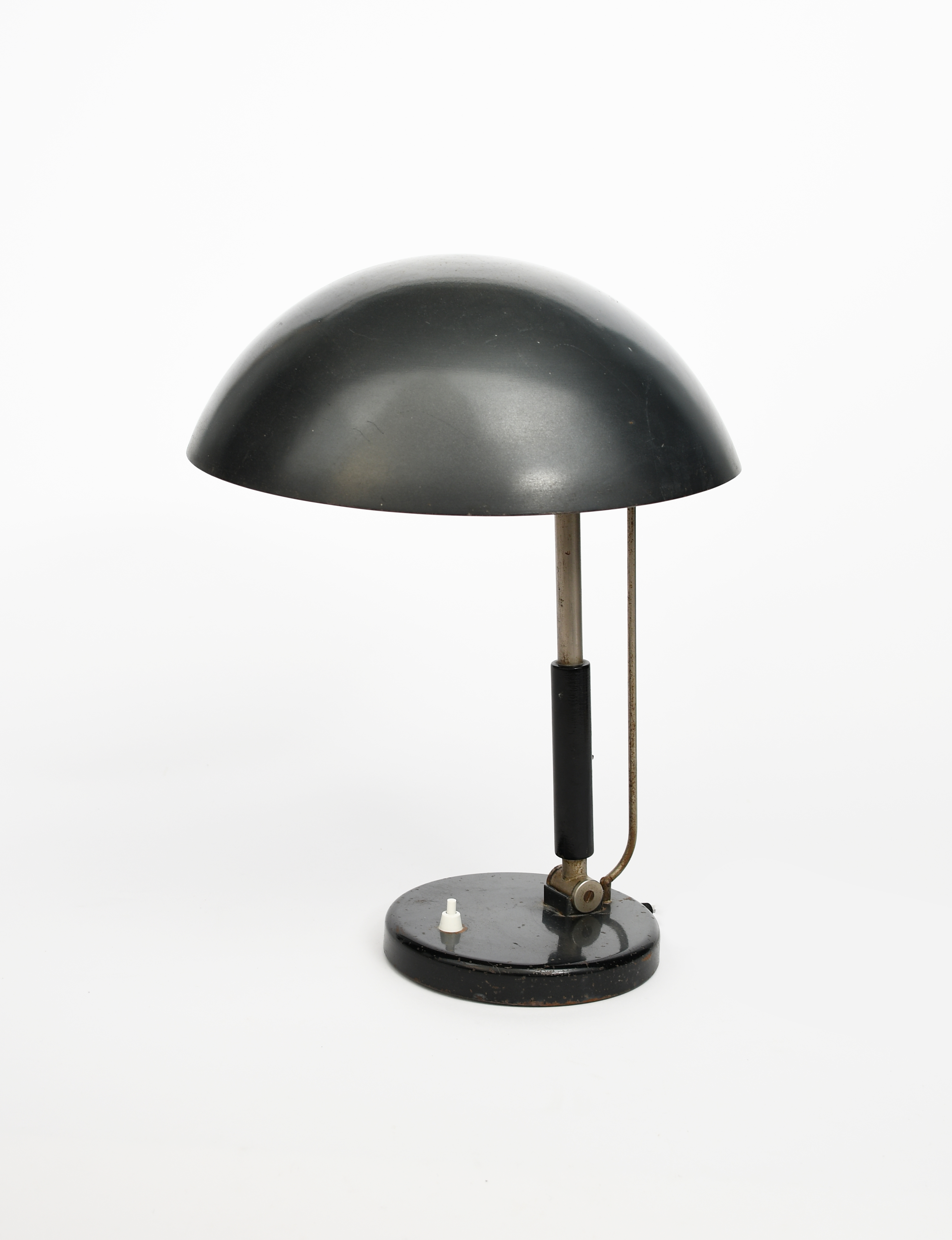 A Bauhaus style enamelled metal table lamp designed by Karl Trabert, on circular base, enamelled black, unsigned, 44cm. high