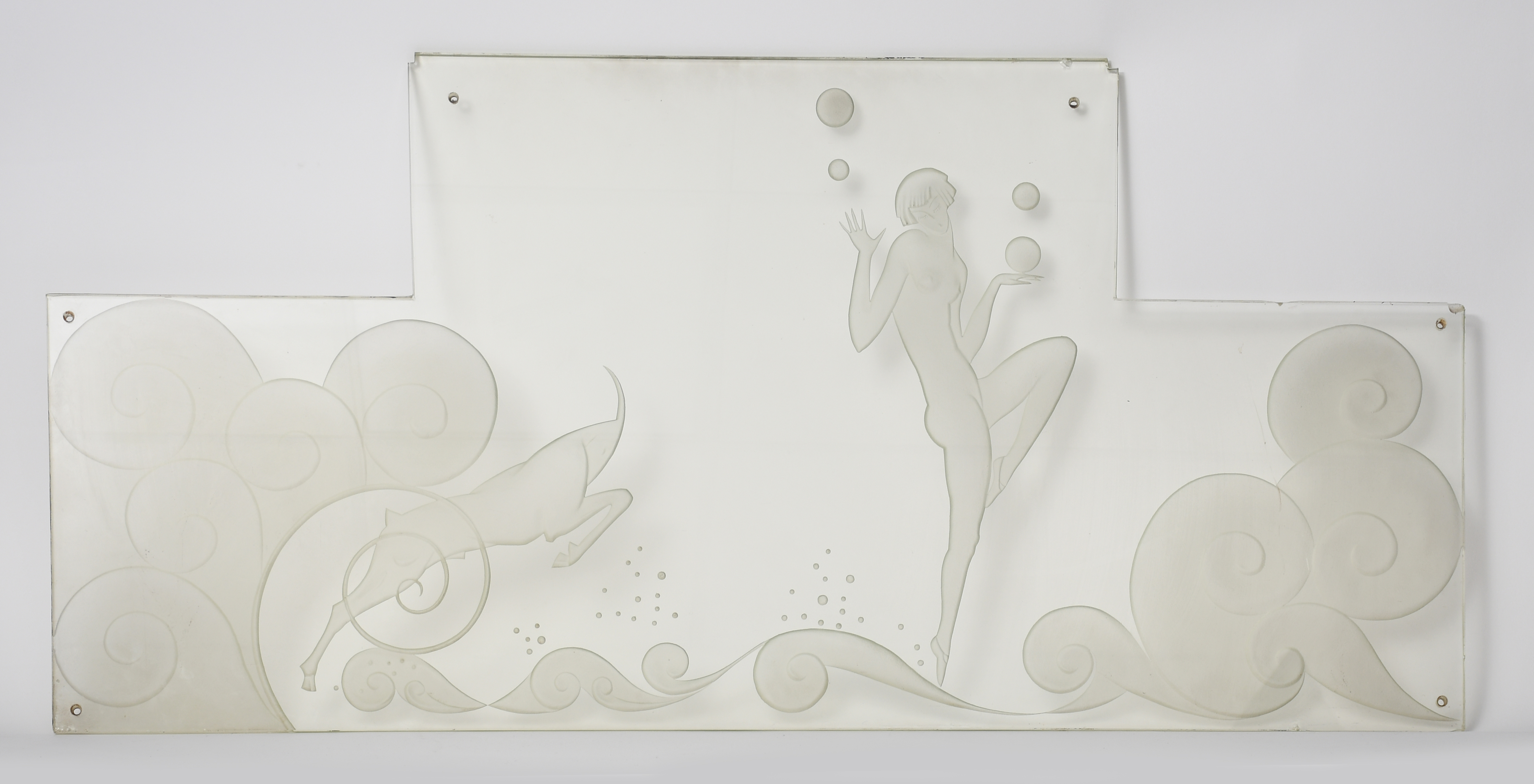 An Art Deco frosted glass panel, the shaped panel decorated with a naked maiden and leaping gazelle,