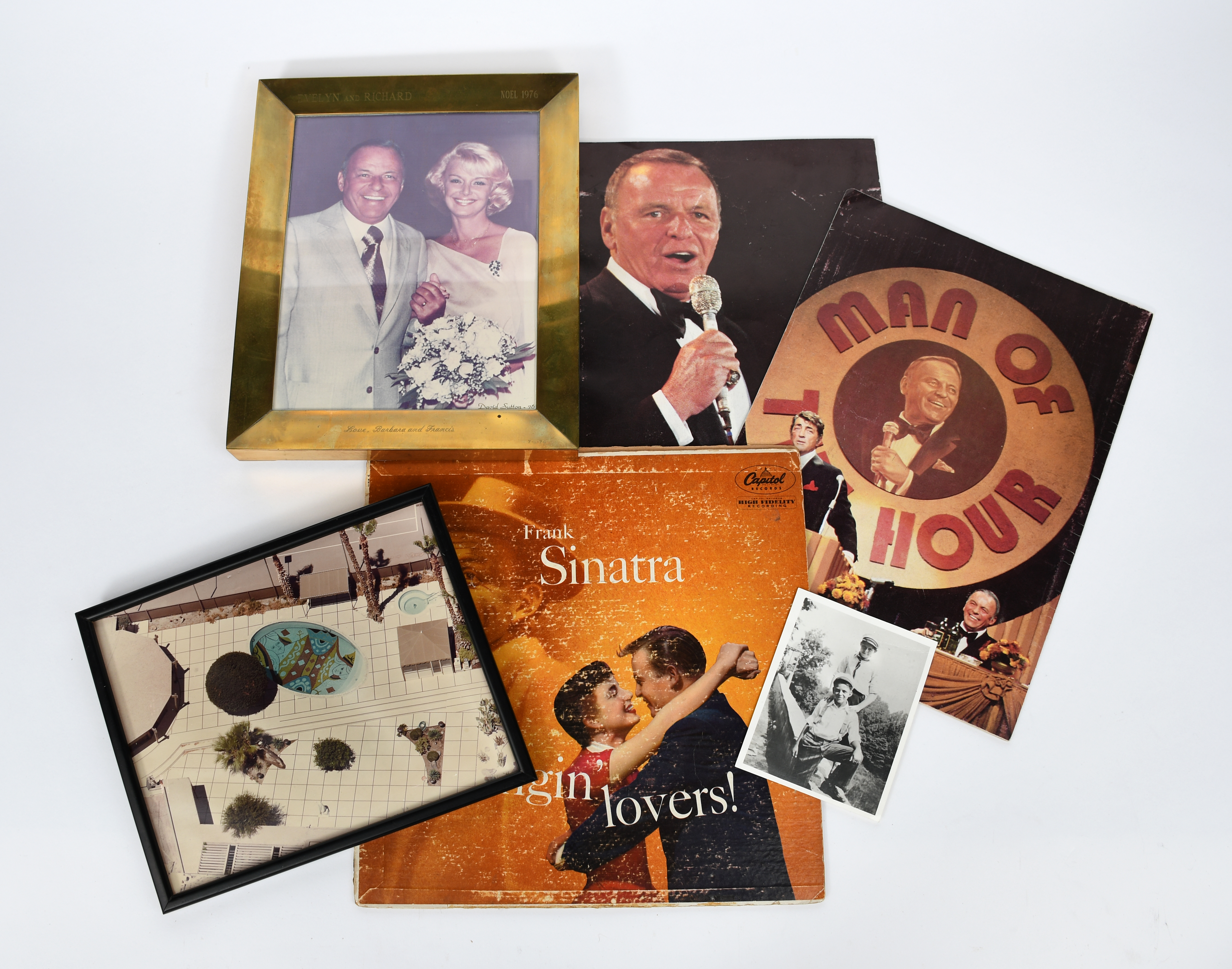 'Songs for Swingin' Lovers!' a signed copy of the LP record by Frank Sinatra, and a collection of ephemera relating to Frank Sinatra and Richard Condon, comprising; a photograph of Frank Sinatra's swimming pool with motif from The Manchurian Candidate by Richard Condon, two Frank Sinatra programmes, a black and white photograph of Frank Sinatra and a framed Christmas photograph of Frank Sinatra and Barbara Sinatra, 1976 dedicated to Evelyn & Richard (Condon), (6)