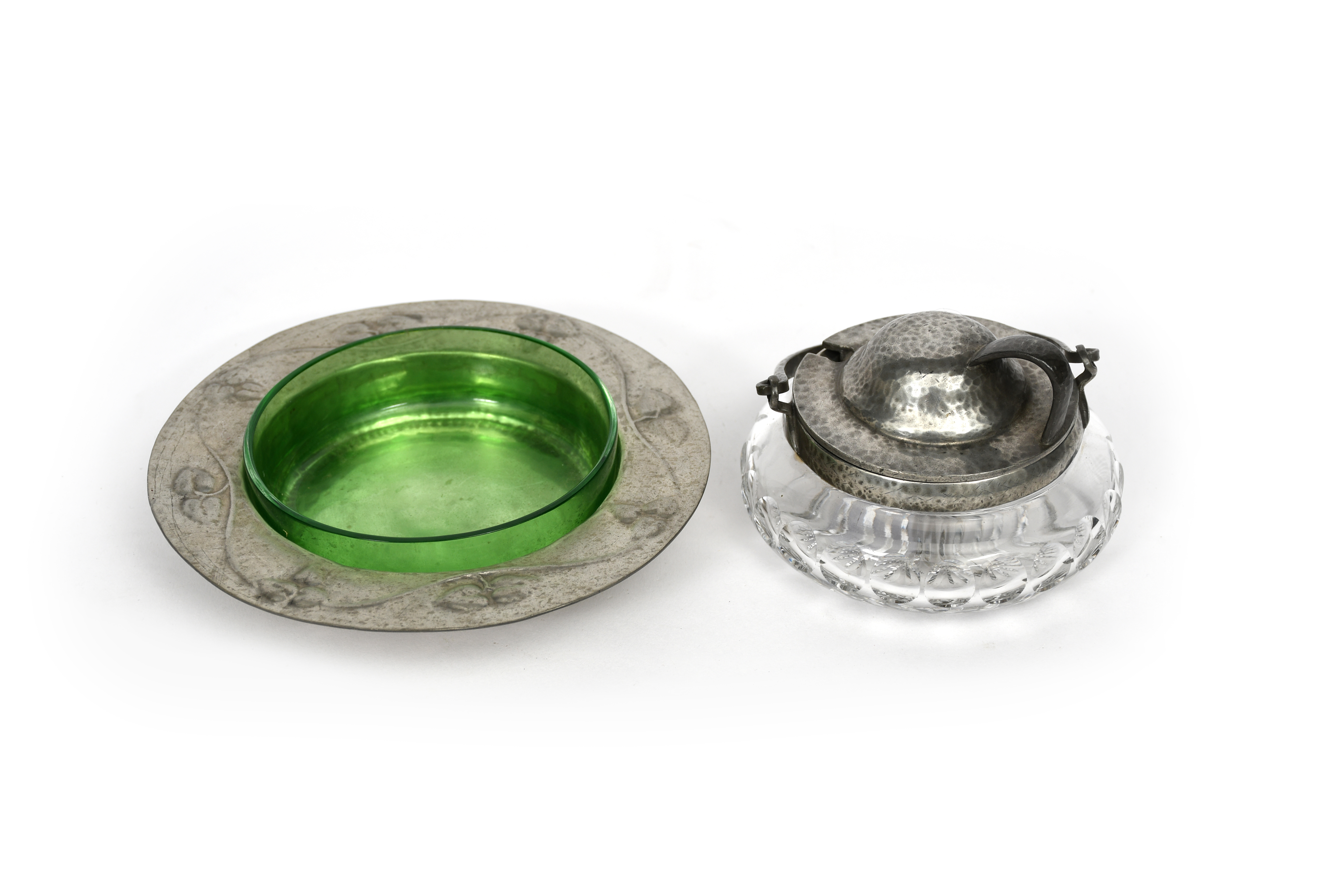 A Liberty English Pewter and glass preserve pot and cover designed by Archibald Knox, model no.01031, the domed pewter cover with streamlined loop handle, hammered finish, clear cut glass body, and a Liberty Tudric Pewter butter dish with green glass liner, model no. 0202, stamped marks, 10.5cm. wide (preserve pot), 16cm. wide (butter dish), (4)