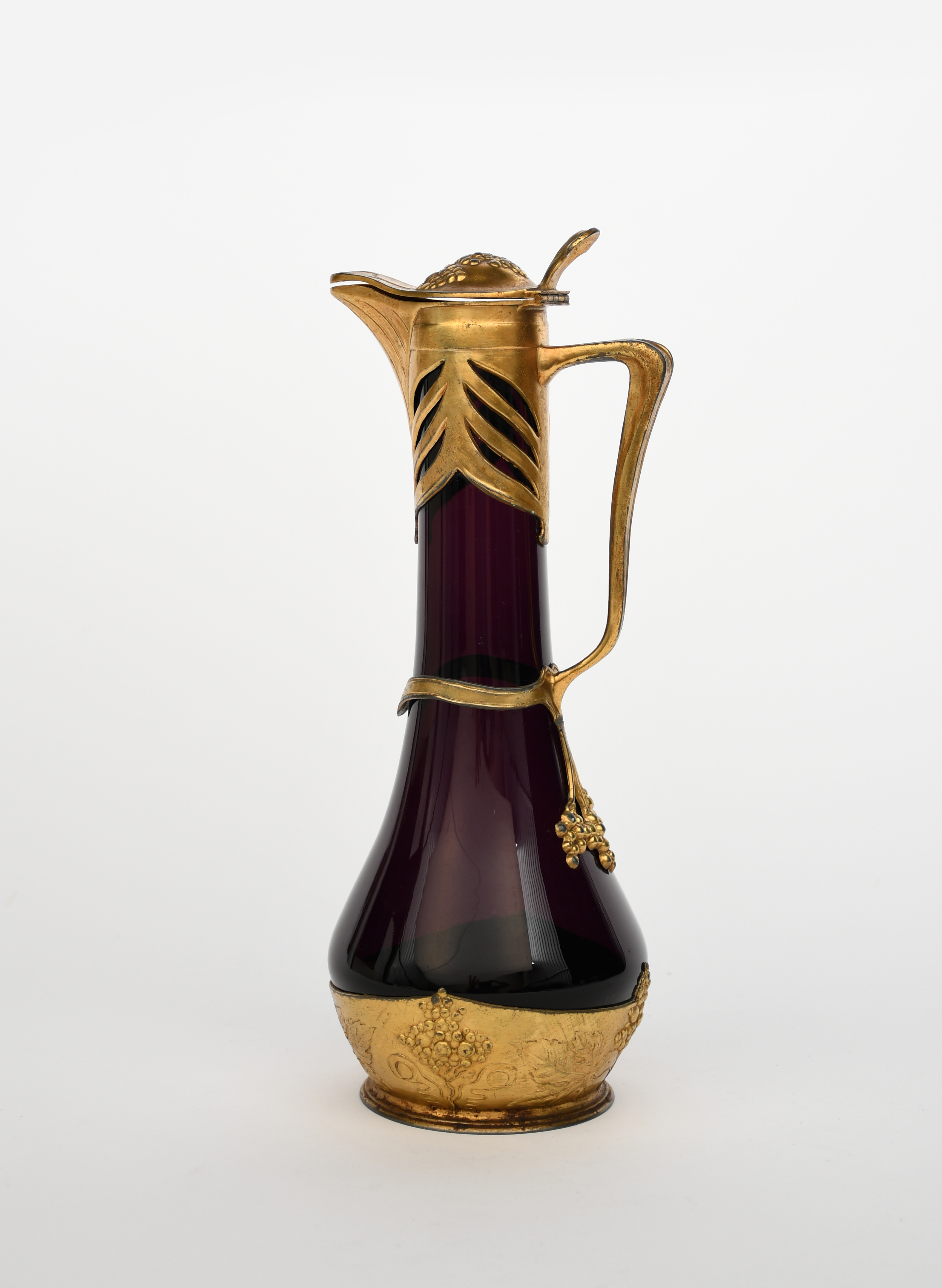An Art Nouveau Osiris gilt metal and glass claret jug, model no.502, cast in low relief with panels of fruiting grape vine, stamped marks 31cm. high