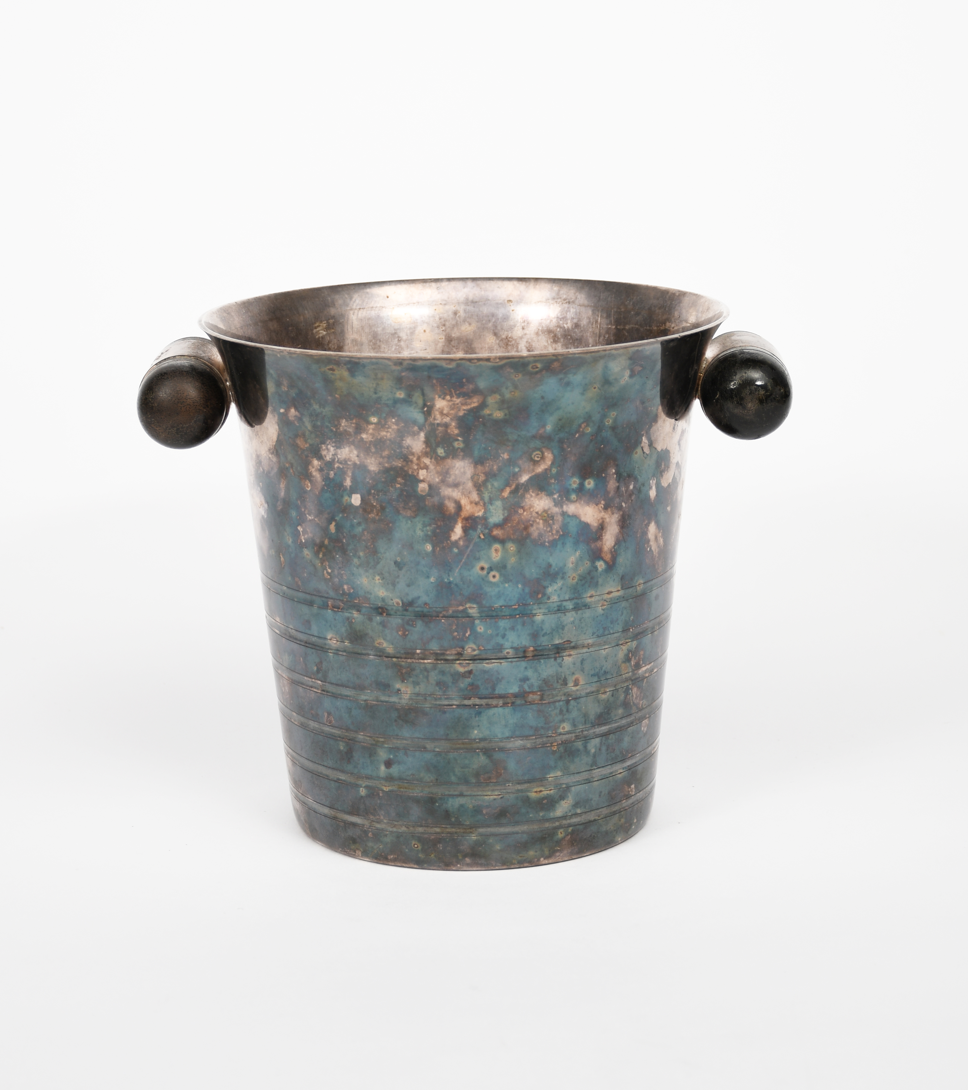 An electroplated wine cooler or ice bucket probably Christofle, flaring cylindrical form with streamlined wood handles, worn stamped makers mark to base, 20.5cm. high