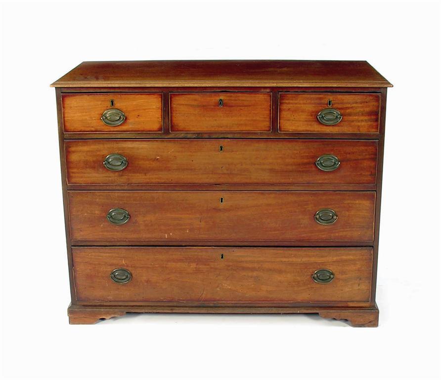 An early 19th century chest, the applied moulded edge top above three short and three long graduated drawers fitted oval brass plate handles on bracket feet, reduced, 35.5in (90cm) h, 45.5in (115.5cm) w, 21.25in (54cm) d.