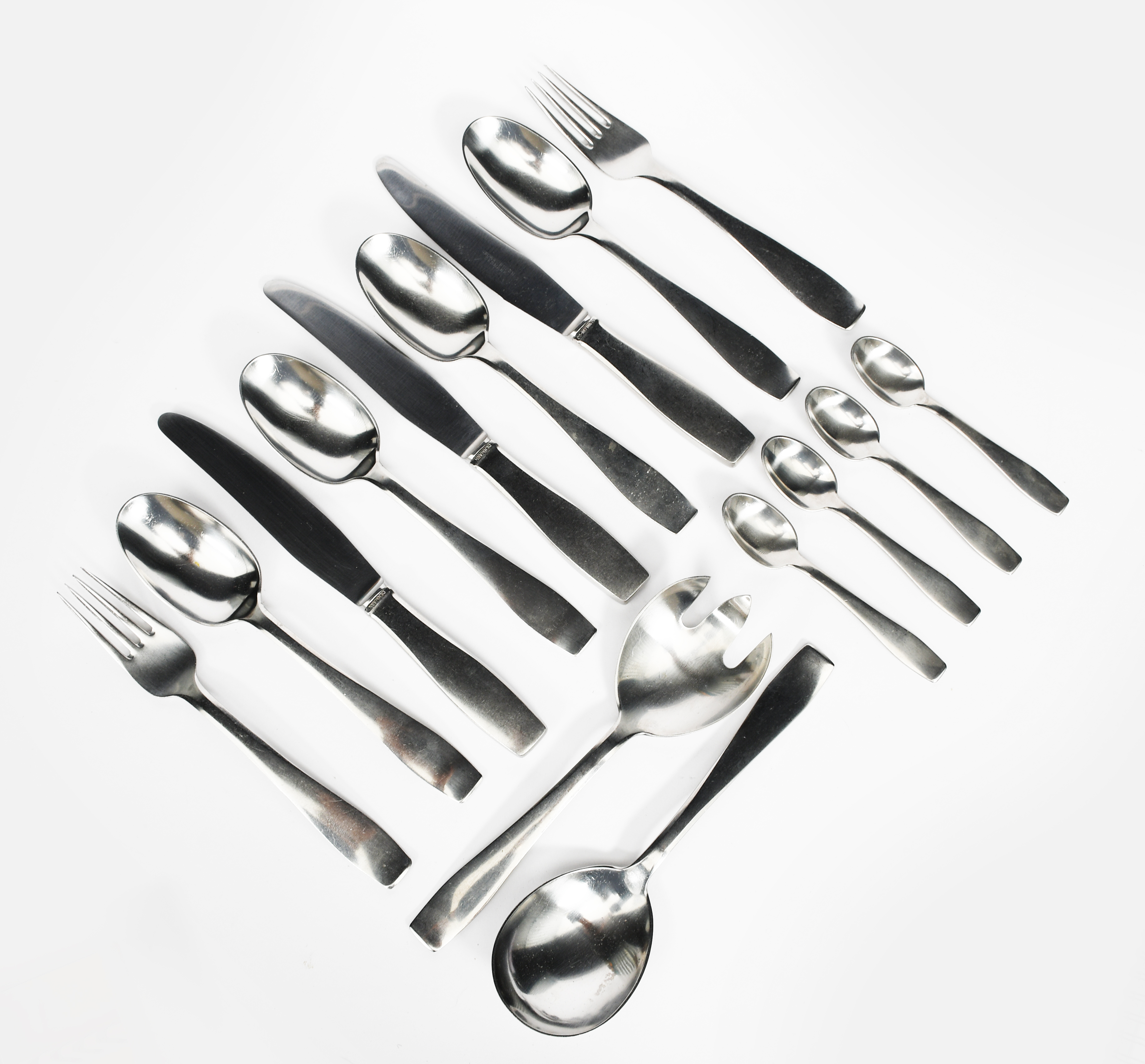 A Georg Jensen stainless steel cutlery service, comprising; six dinner knives, forks and spoons, six dessert spoons, six lunch forks and knives, six fish knives and forks, six teaspoons, two serving spoons and a fork, stamped marks, 20cm. long (serving spoons), (57)