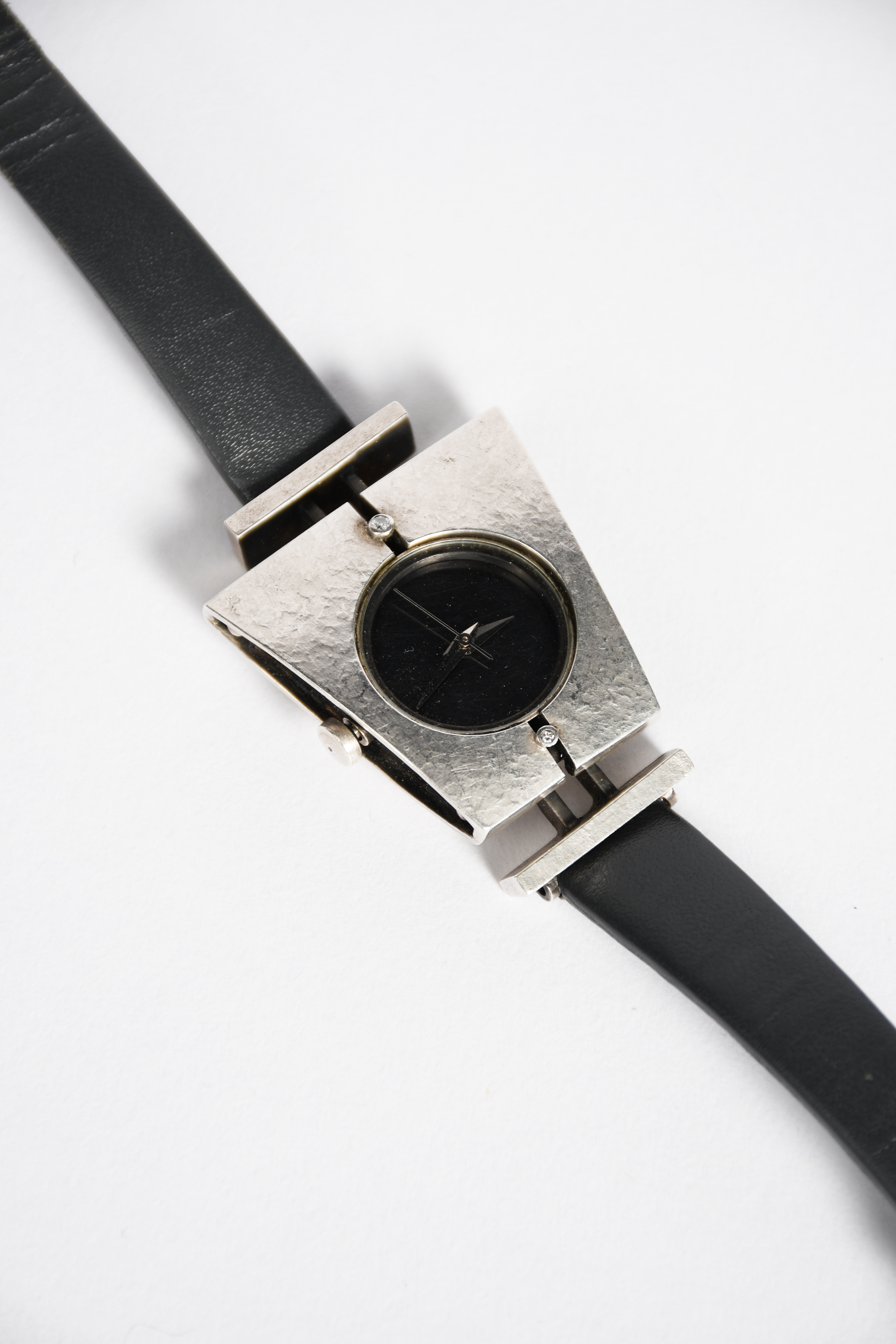 A silver and diamond watch by Louise Parry, hammered silver case, black rhodium plated dial