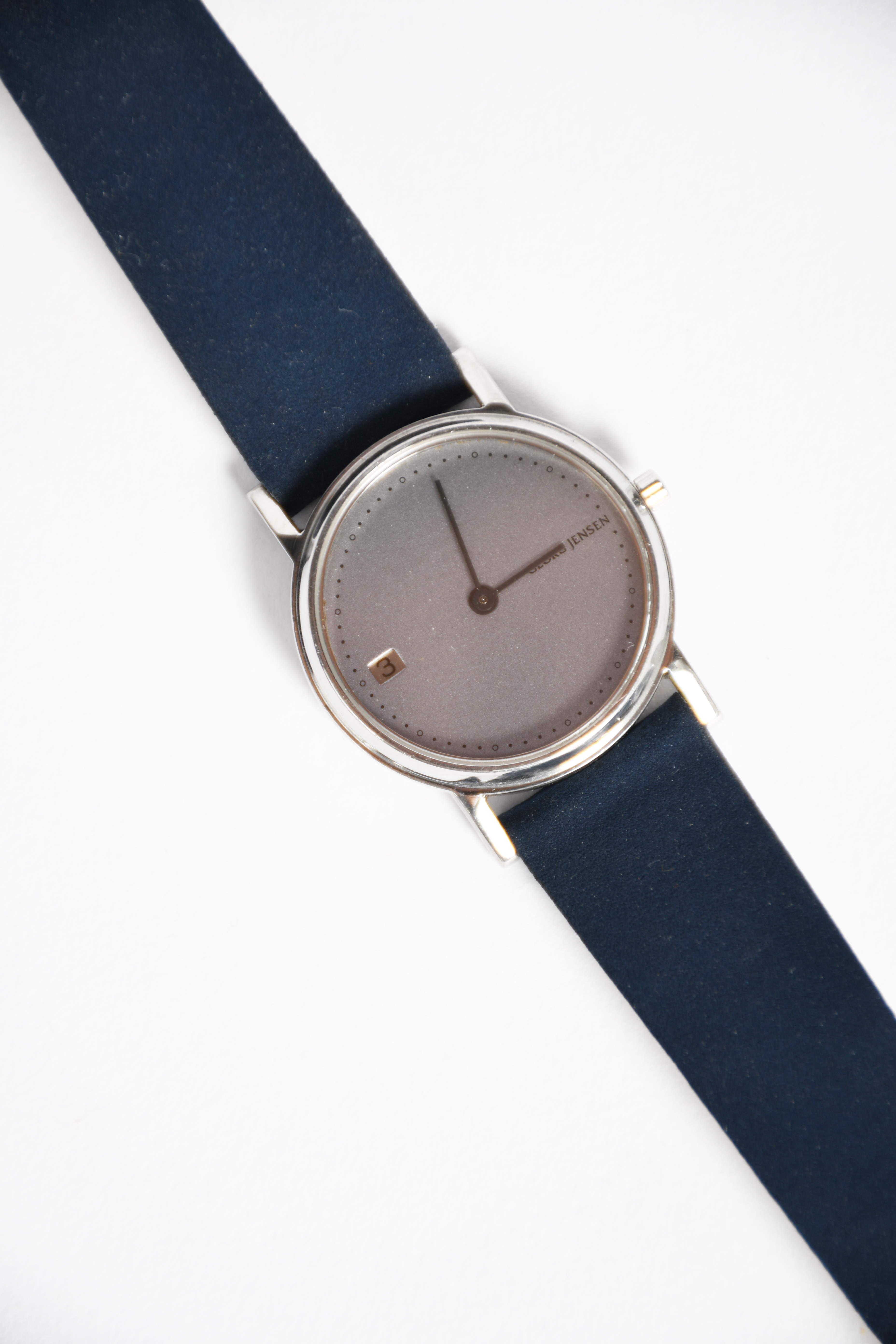 A Georg Jensen ladies watch designed by Jorgen Moller, with grey dial, blue strap, 3cm. diam dial.