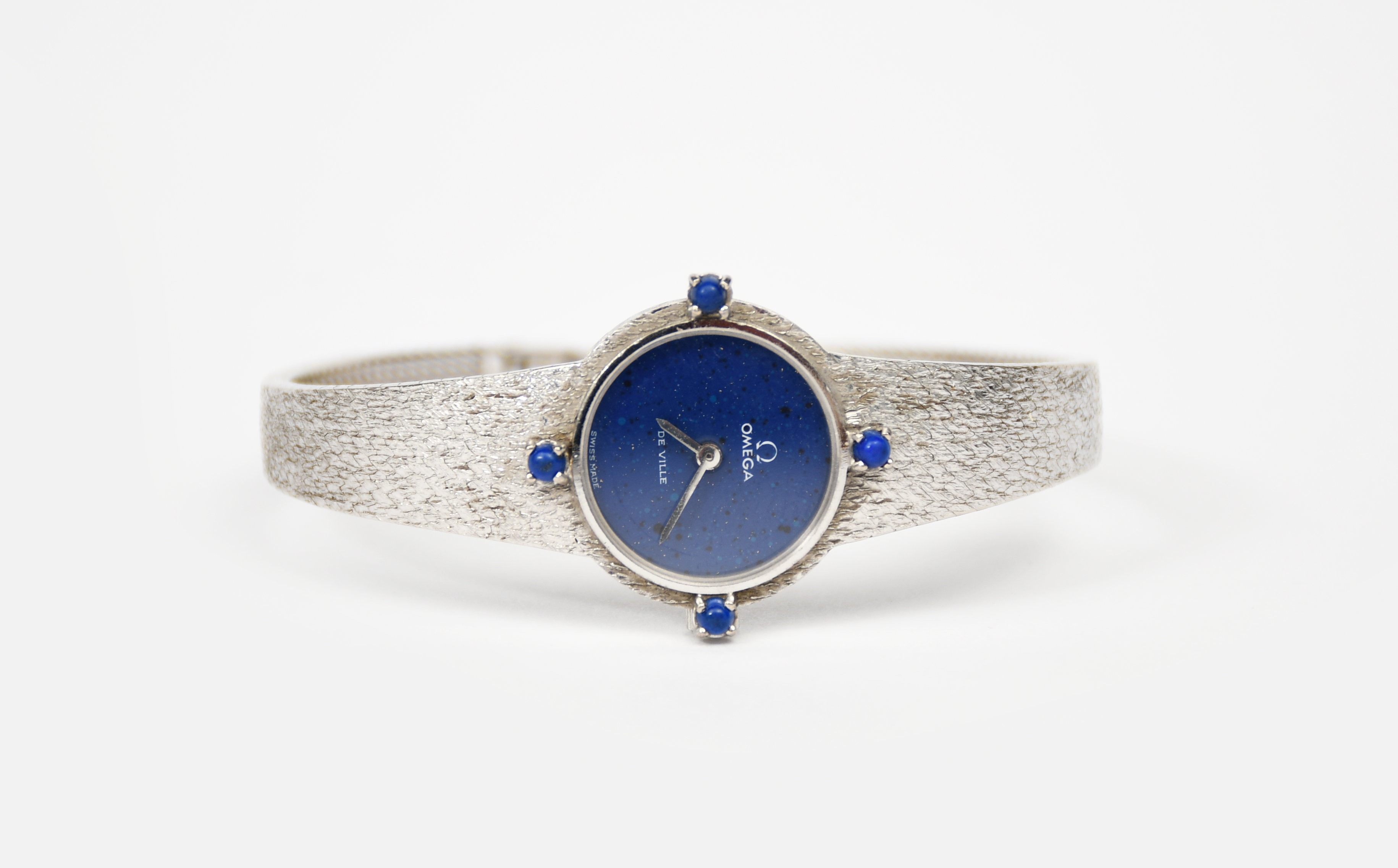 An Omega silver ladies dress watch, set with four small lapis stones, circular blue dial, stamped marks, 2.2cm. diam. (dial)