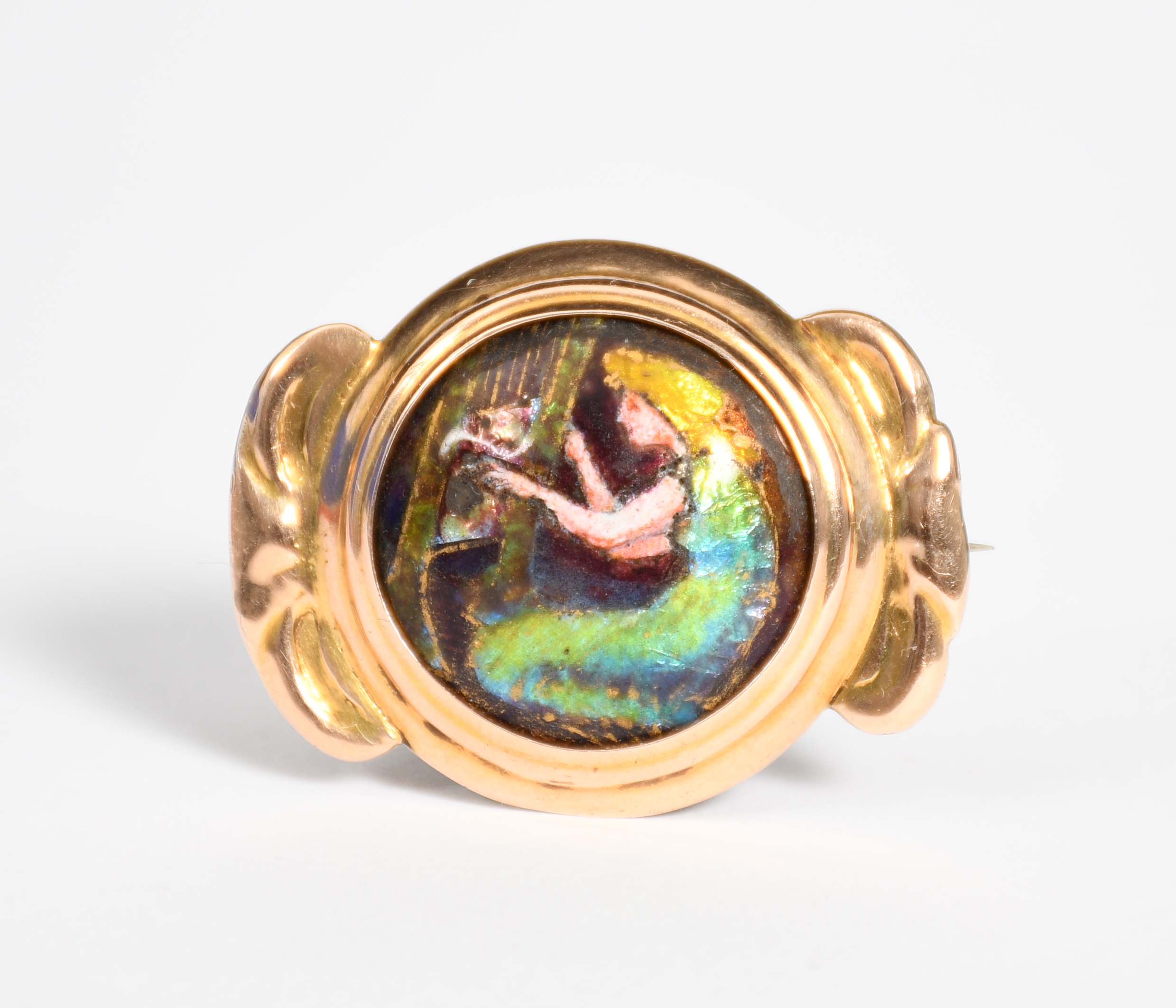 'Saint Cecilia' a small gold and enamel brooch, circular enamel depicting St Cecilia playing an