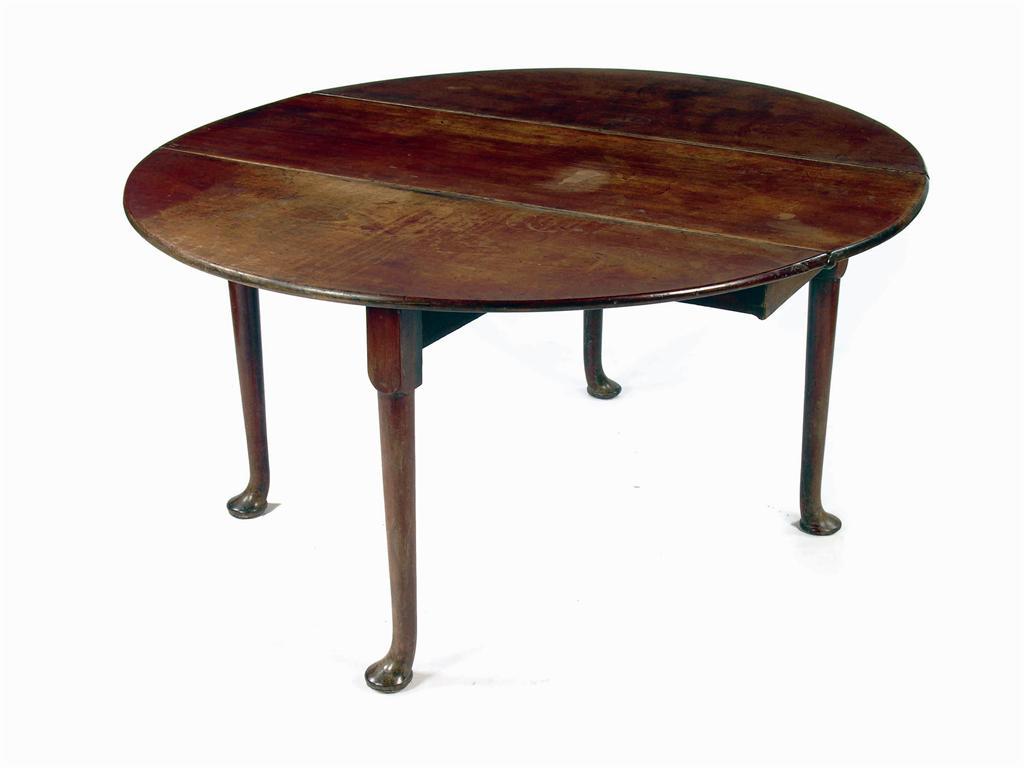 A mid 18th century walnut drop leaf table, the oval top on turned club legs to pad feet, (part of one pad missing, old restoration), 28in (71cm) high, 57.5 x 53.75in (146 x 136.5cm).
