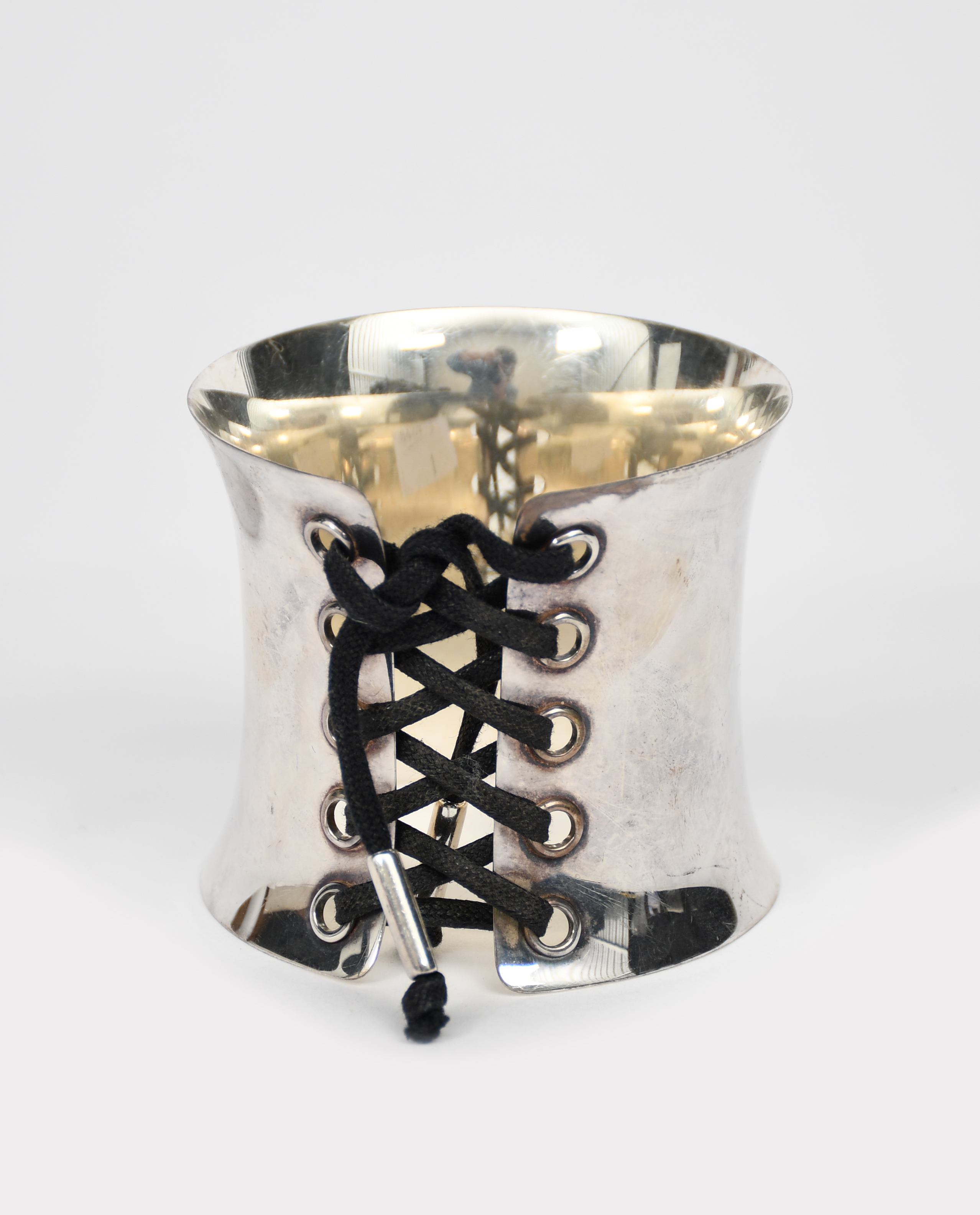 A Georg Jensen silver Corset cuff bangle, designed by Regitze Overgaard, waisted form with waxed string chord, stamped marks, 6.5cm. high