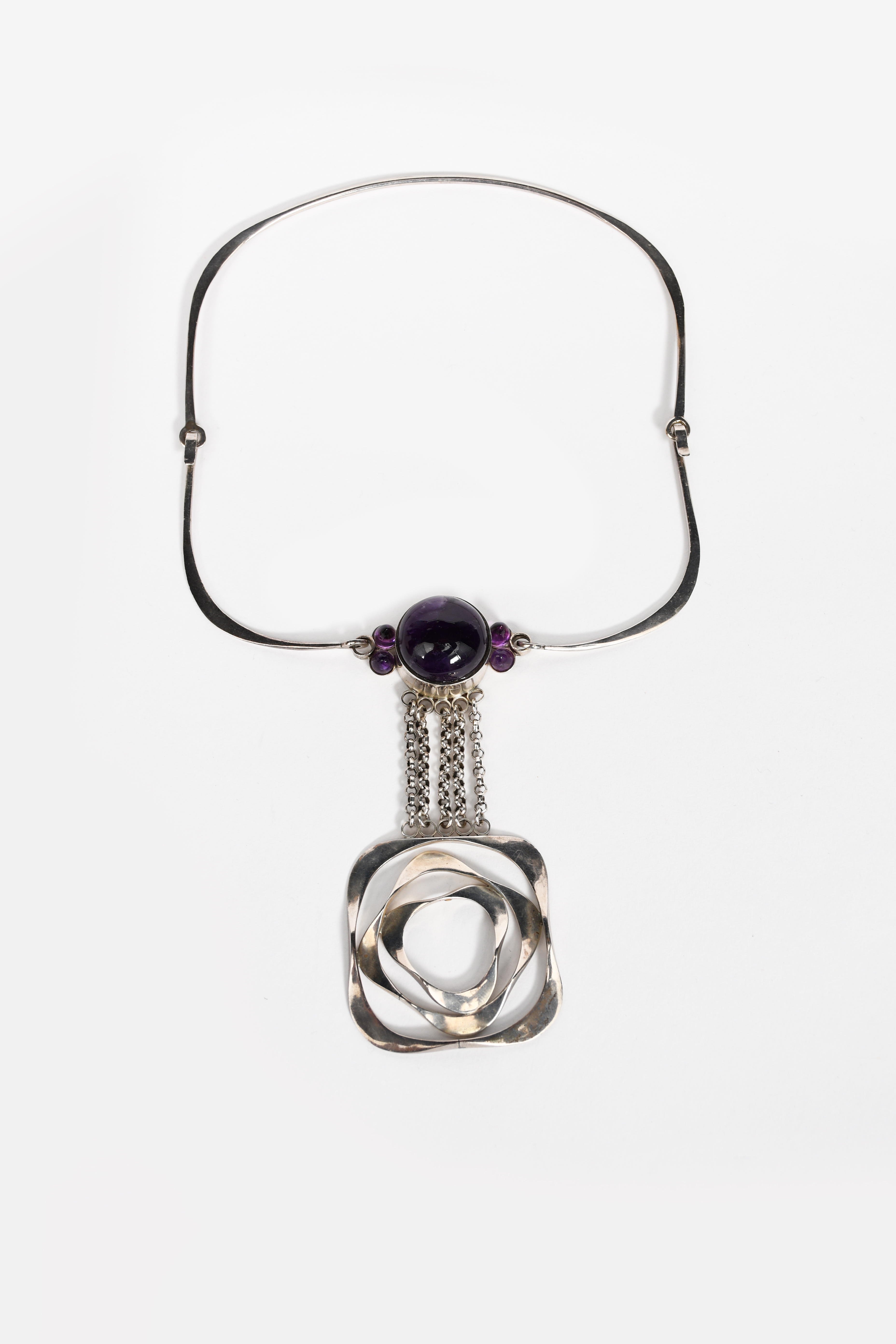 A David Anderson silver and amethyst pendant necklace, pierced square section drop on five chains, suspended from link collar necklace with a large amethyst cabochon flanked by the smaller cabochon, stamped marks, 10cm. drop