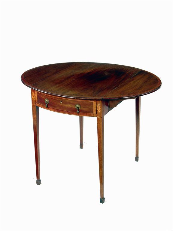 A 19th century mahogany Pembroke table, the oval top crossbanded in kingwood with stringing above a frieze drawer fitted later handles, flanked by patera headed square tapering legs to spade feet, 28in (71cm) h, 38.25 x 30.75in (97 x 78cm) open.