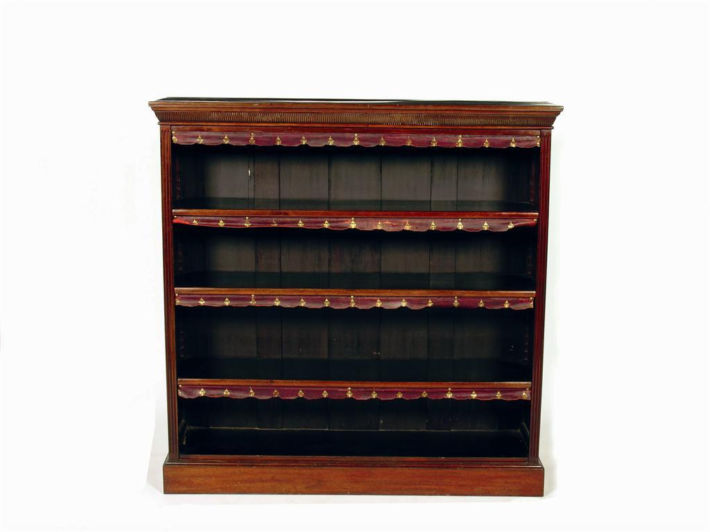 A late Victorian mahogany open bookcase, the ribbed moulded frieze above adjustable shelves, to a plinth base, 48.5in (123cm) h, 48.25in (122.5cm) w, 13in (33cm) d.
