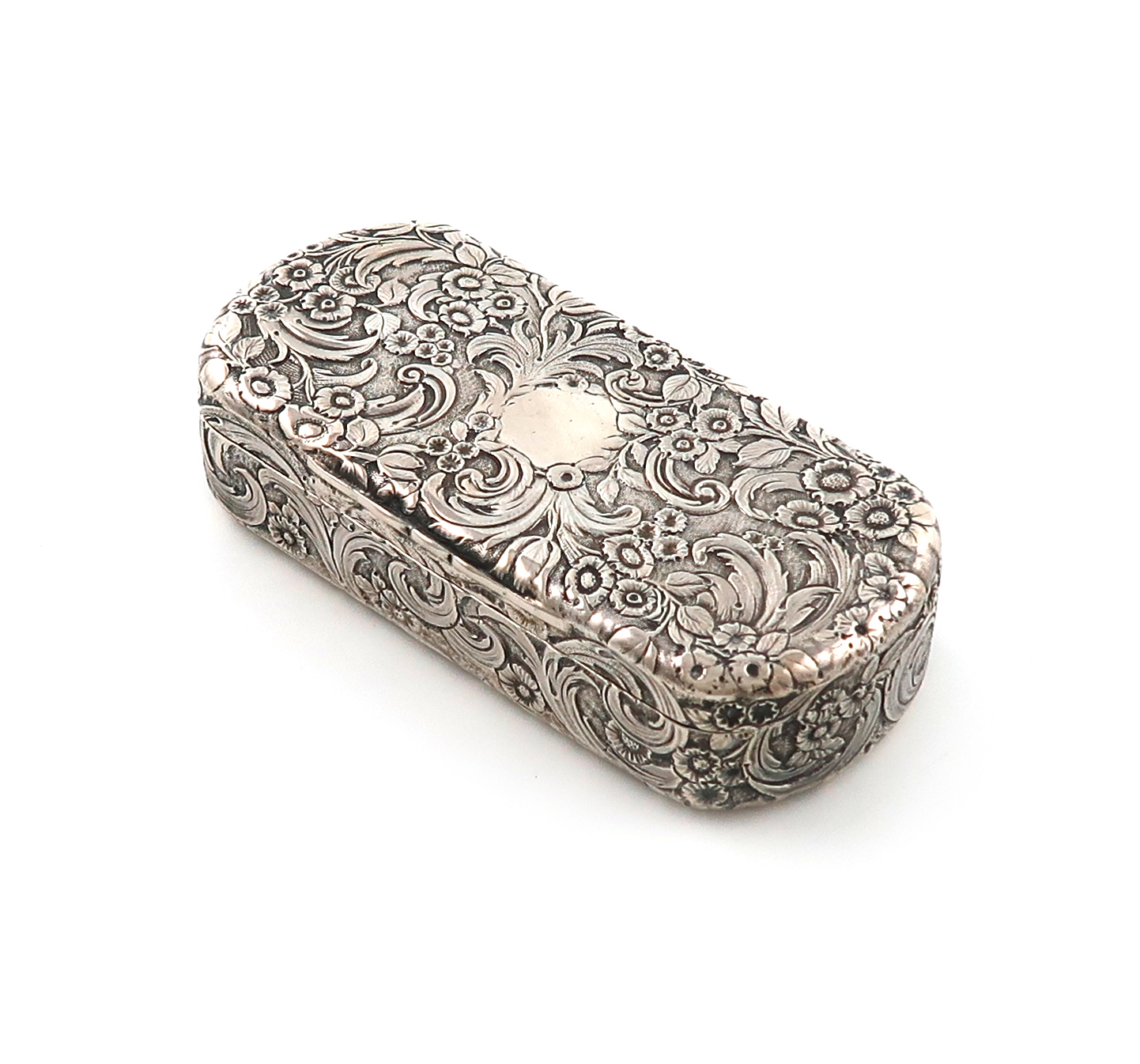 rounded rectangular form, chased foliate scroll decoration, gilded interior, length 10cm, approx. weight 4.5oz.