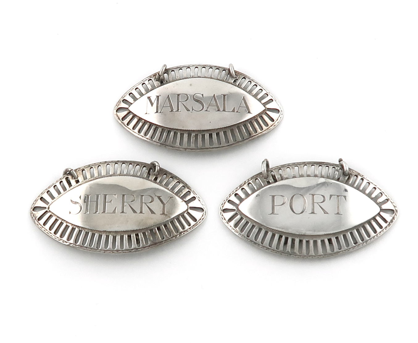 oval navette form, with a bright-cut and pierced slat border, incised 'Port', 'Marsala' and 'Sherry', length 5.2cm, approx. weight 1.1oz. (3)