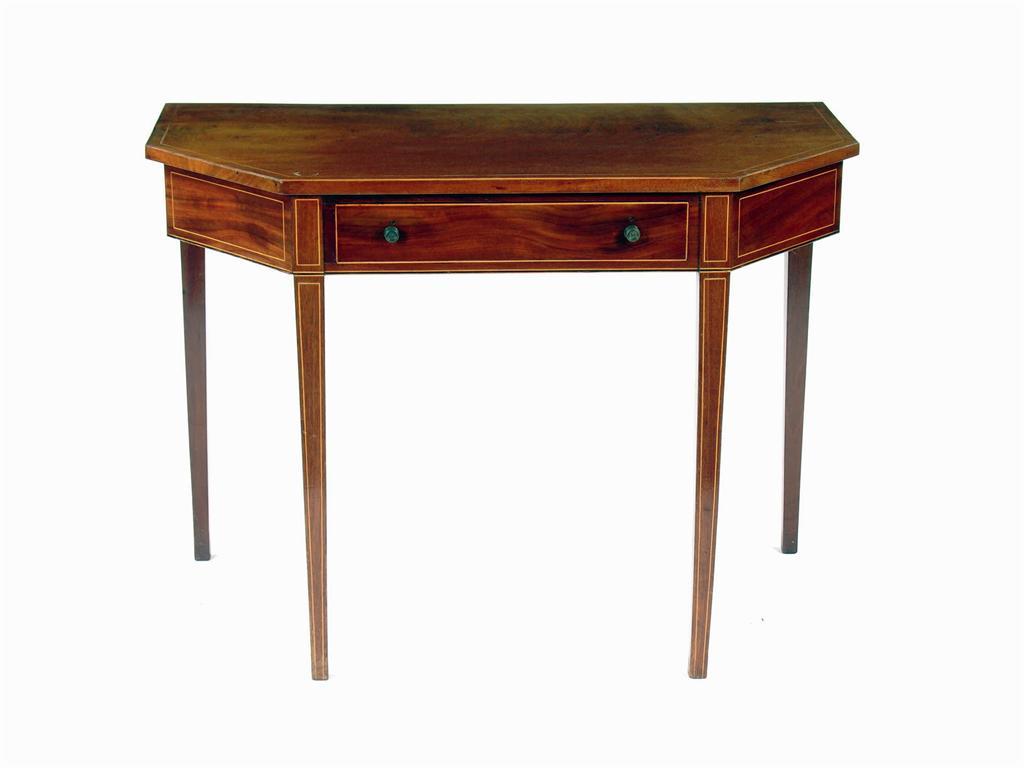 A mahogany side table, inlaid boxwood stringing with canted corners and a single frieze drawer on square tapering legs, 19th century and later, 29in (74cm) h, 40.25in (102cm) w, 20.75in (52.5cm) d.