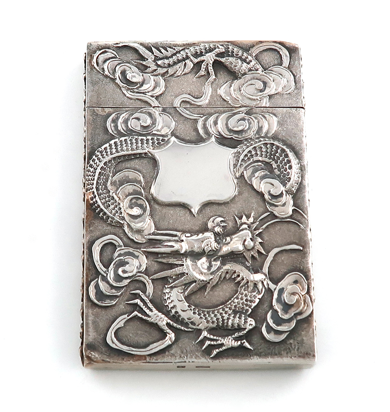 rectangular form, embossed with a dragon on a matted background, with a vacant shield cartouche, the reverse with cherry blossom, pull-off cover, length 9.7cm, approx. weight 2.9oz.