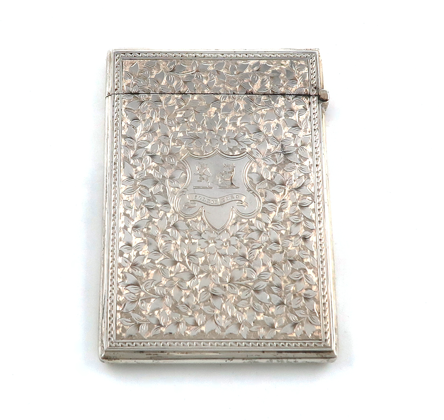 rectangular form, engraved foliate decoration, with a cartouche, engraved with two crests and a motto, length 9.8cm, approx. weight 2.9oz.