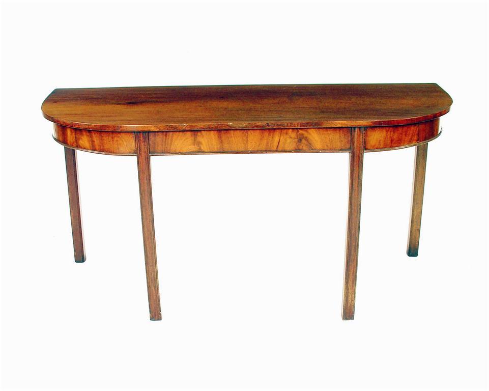 A mahogany side table, the D-shaped top to a plain frieze with an applied moulding on moulded chamfered square legs, George III and later, 28.25in (72cm) h, 58.5in (149cm) w, 23.5in (60cm) d.