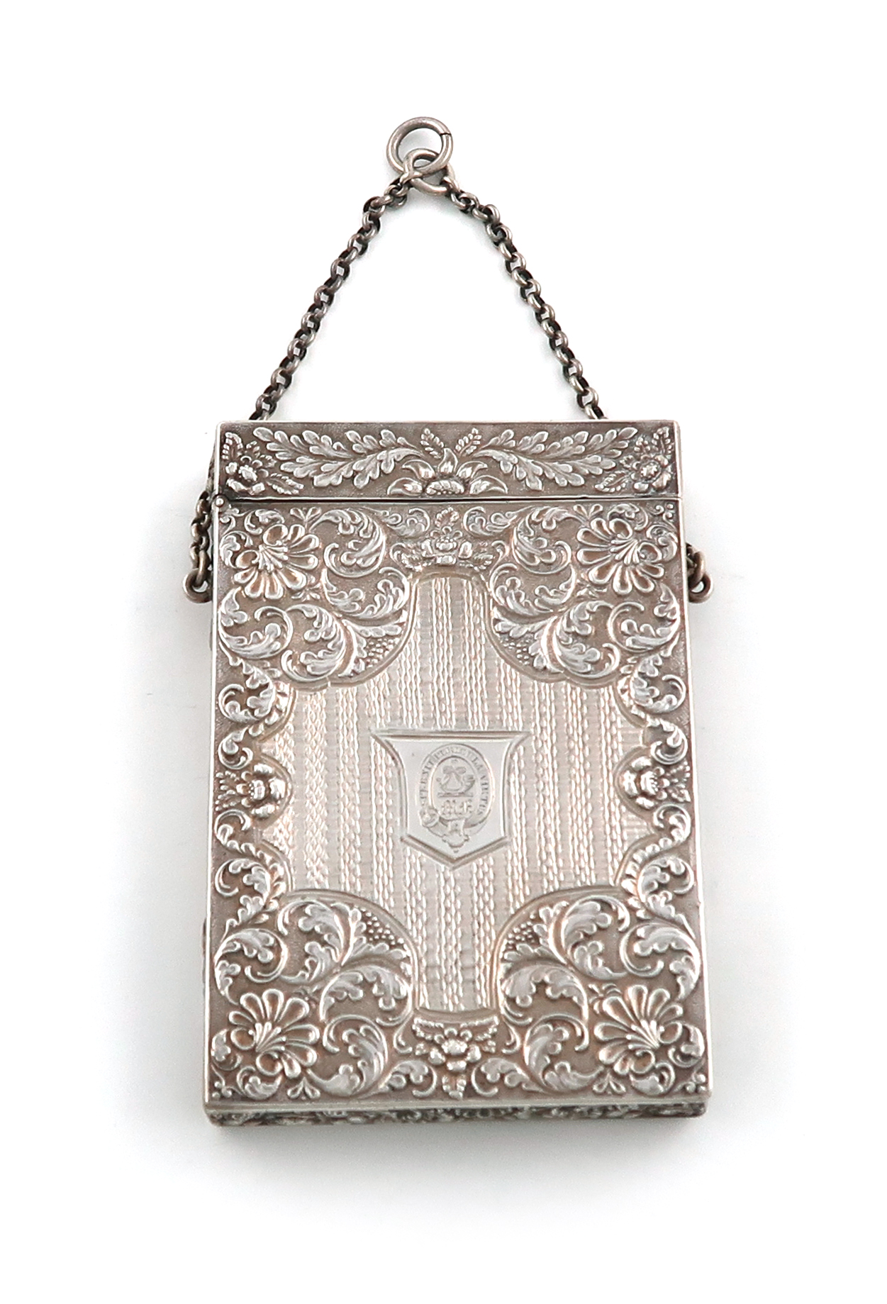 rectangular form, with engine-turned and chased foliate, shell and scroll decoration, the sides with roses, thistles and shamrock, hinged cover, engraved with a crest, the reverse inscribed 'Gift of a Friend', with a chain attachment, in a later fitted case, length 9.1cm, approx. weight 2.9oz.