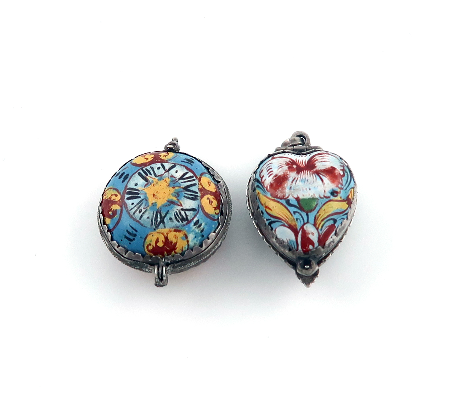 heart form, created flowers on a light blue ground, the interior with a dividing sleeve and four compartments, with a ring attachment, length 3.2cm, plus a circular locket pomander with similar decoration, the interior with six compartments, diameter 2.5cm. (2)