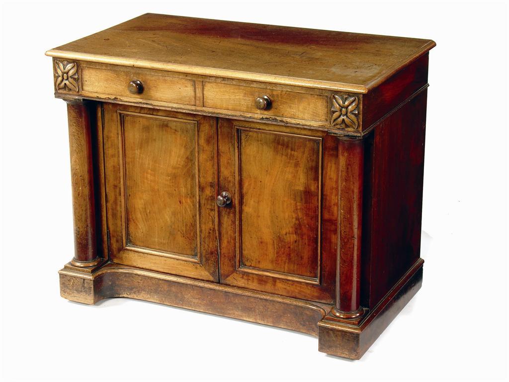 A Victorian mahogany side cabinet, the later top above a pair of frieze drawers and a pair of cupboard doors enclosing a shelf flanked by turned columns to a concave base, on wooden castors, 28.25in (71.5cm) h, 35.75in (91cm) w, 20.75in (53cm) d.