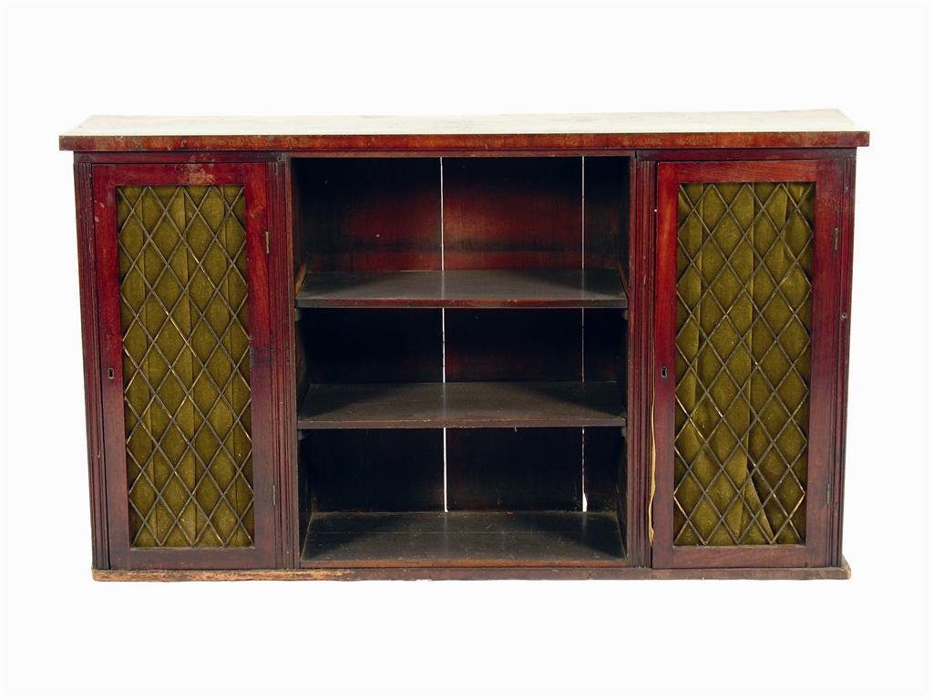 A rosewood side cabinet, the mahogany top to two central shelves flanked by a pair of brass grille doors with later fabric backs, 33.5in (85cm) h, 57in (145cm) w, 13.5in (34cm) d.