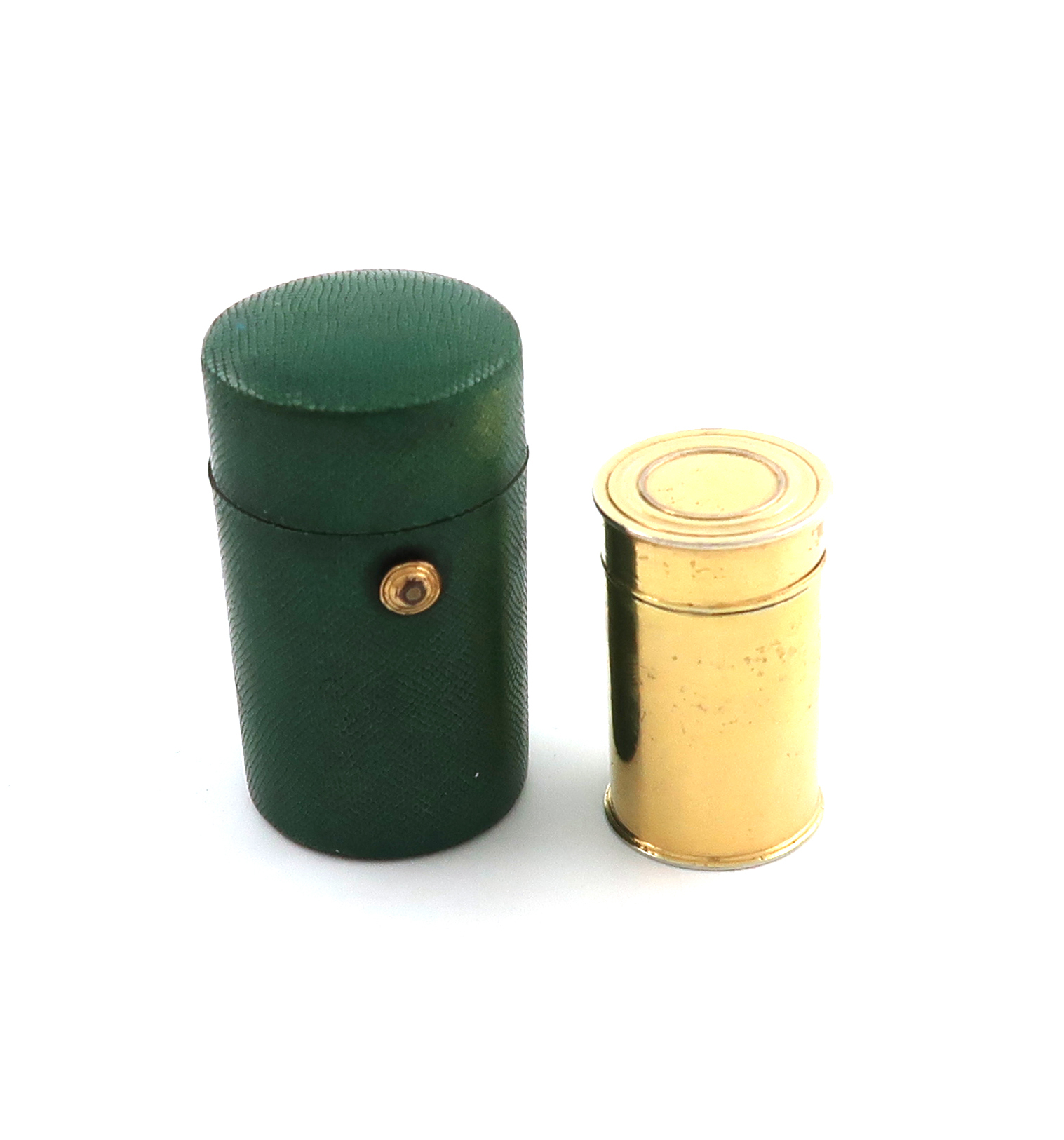 cylindrical form, the screw-off cover opens to reveal a pull-off lid with a ball finial, with a snuff spoon, in a fitted shagreen covered case, height 3.7cm, length of spoon 4.3cm. (2)