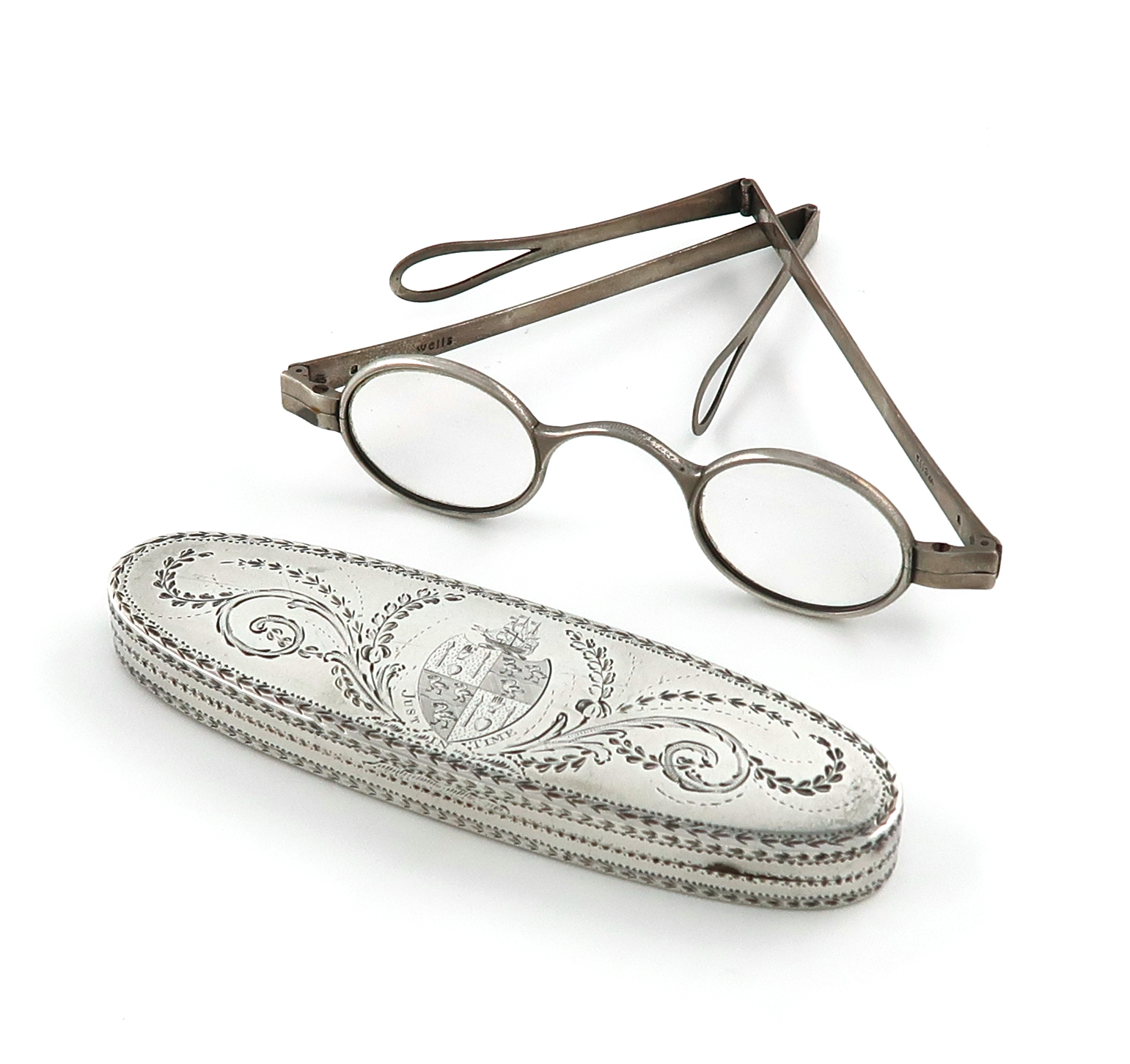 oval navette form, bright-cut decoration, the cover and base engraved with an armorial within scroll mantling, velvet liens interior, fitted with a pair of spectacles, incuse marked 'Wells', length 11.8cm, approx. weight 2oz.