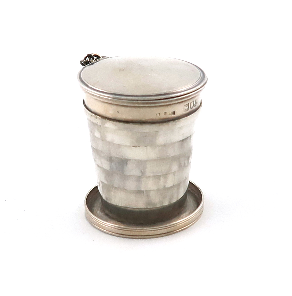 tapering circular form, with a cover and chain, full open height 5cm, approx. weight 1.7oz.